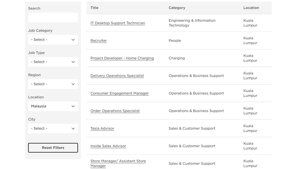 最后,根据他们网站上的工作地点都是位于首都 Kuala Lumpur,只不过目前他们大马份公司的详细地址暂时不得而知,那有兴趣到特斯拉工作的朋友,可以点击这里查看和申请,而现在才是 4 月份,要是一切人员招募顺利,大马分公司或有机会在今年内开张,各位朋友们期待吗?