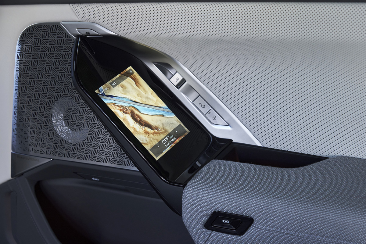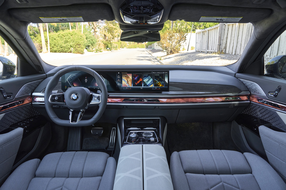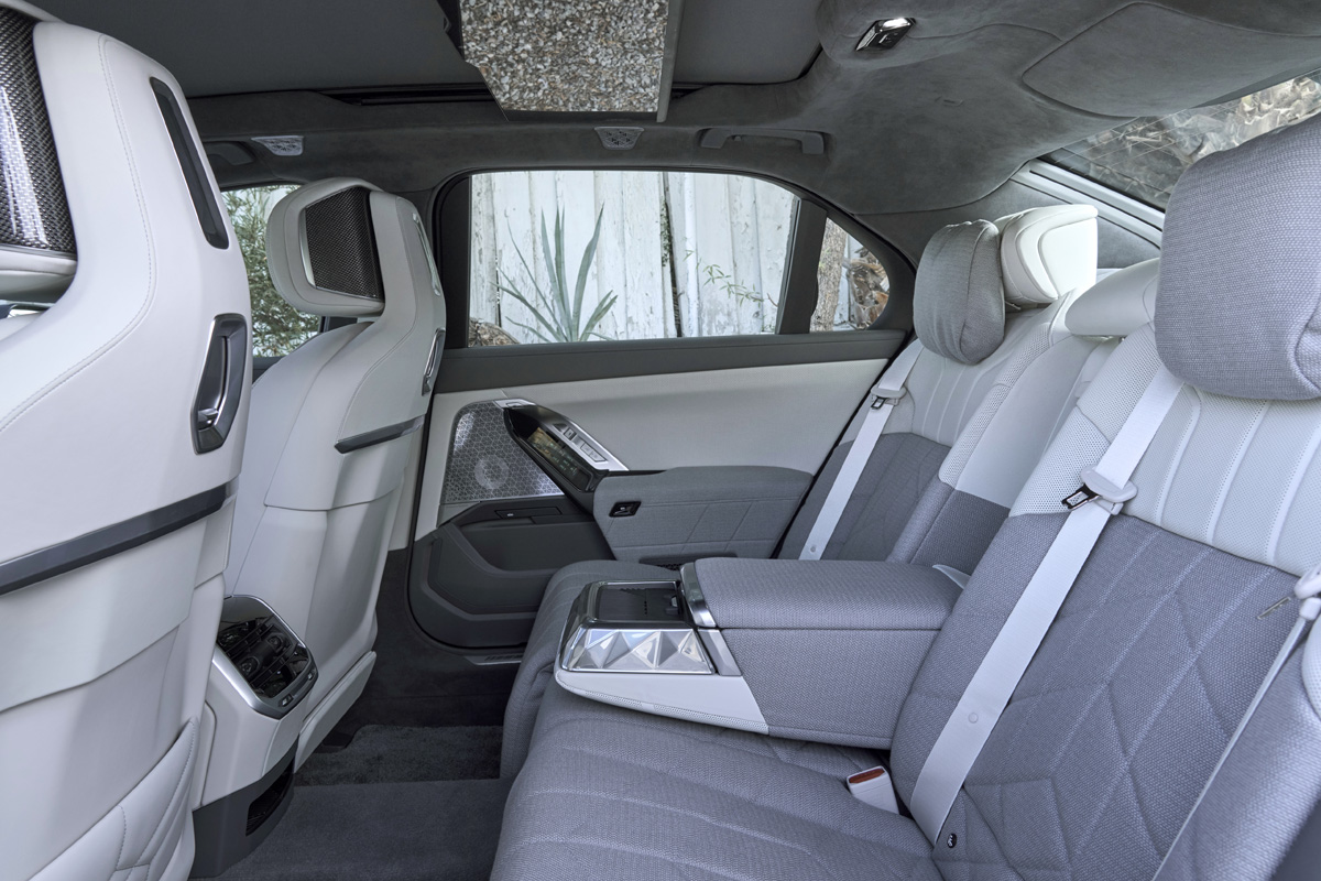 来到内饰的部分,是原厂最新世代的双联屏设计,有 12.3 寸全液晶仪表和 14.9 寸中控触屏主机,而且它的氛围灯被融入到饰板内,因此晚上点亮时的效果十分绚丽,不过作为一辆老板座驾,它的主要配备还是集中在后排,它的后排最显眼的就是横置在上方的 31.3 寸 8K 显示屏(M Sport 车型专属),而且在后门还内置了 5.5 寸的触屏控制面板让你控制车内的功能,其余配置像是 Bowers & Wilkins 高级音响、Sky Lounge 全景天窗、按摩座椅、电动开启和关闭的车门等都可以在这款车上面看到。