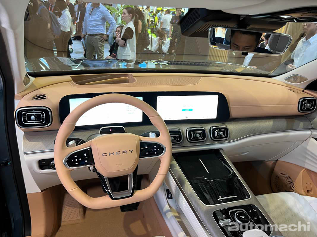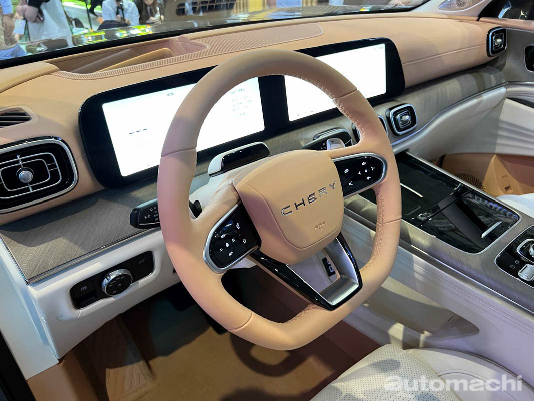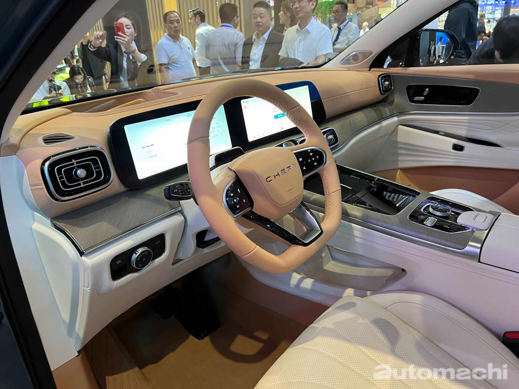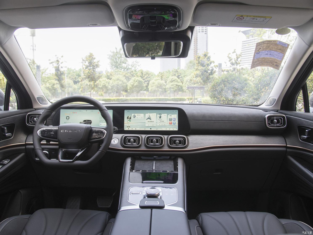 在外观上和之前我们在上海车展上看到的一样,作为全新旗舰车款,它使用了全新的设计语言,外观设计上十分大气优雅,有着造型方正的 LED 头灯组,内置会发光的奇瑞 Logo 的大尺寸镀铬直瀑式水箱护罩,加上下方设计霸气的保险杠,而在车侧它用了修长的线条设计,配上黑色的悬浮式车顶、隐藏式门把手和双色的多幅式轮圈,而在车尾的部分就有着贯穿式尾灯,同时 CHERY 的字样被融入在 Piano Black 的饰板内,至于下方则有镀铬的双边双出排气尾管,整体看起来相当有豪华车的风范。
