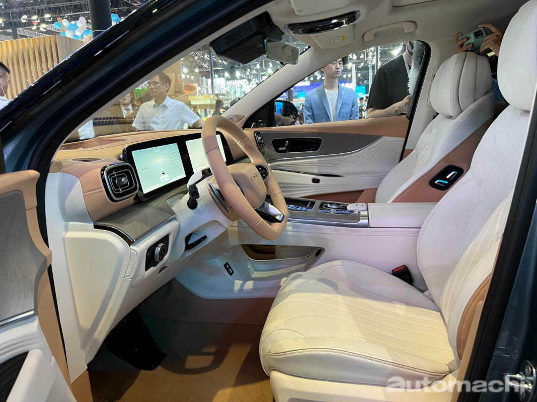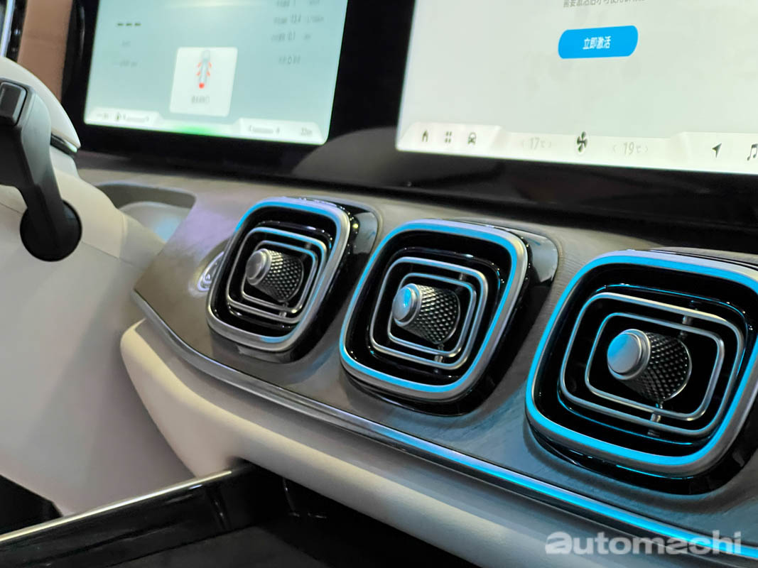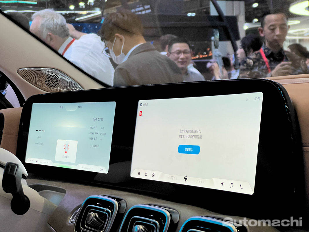 来到内饰的部分,这款车更是十分具有高级感,它采用了双拼色的中控饰板,配上软质塑胶和木纹点缀,整个内装的设计非常精致,而它采用了中国车企常用的双联屏设计,有着 12.3 寸全液晶仪表 + 12.3 寸中控触屏主机,加上 HUD 抬头显示器和冷气控制面板,全车一共有 4 个屏幕,而且它的主机内置了 Snapdragon 8155 的芯片,使用体验预计会非常智能和流畅,另外它有着回字形的冷气出风口和触控式按键,看起来质感相当出色,另外它还配备了全景天窗、14 个 Sony 高级音响和 256 色氛围灯,舒适性配备可说是满配了。