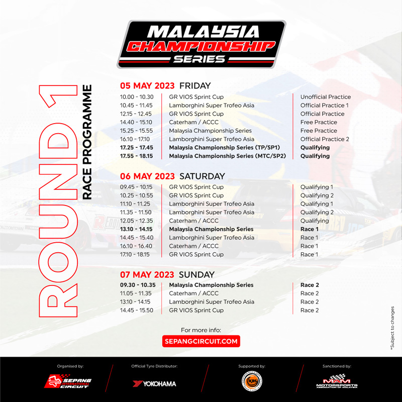 在近日雪邦国际赛道就确认了今年 MCS 的赛程,今年的比赛将分为 4 轮共 7 场赛事,同时第一轮的赛事也会和 TGR Vios Sprint Cup,Caterham/Asia Classic Car Challenge,Lamborghini Super Trofeo Asia 一起举行,详细比赛日期如下:
