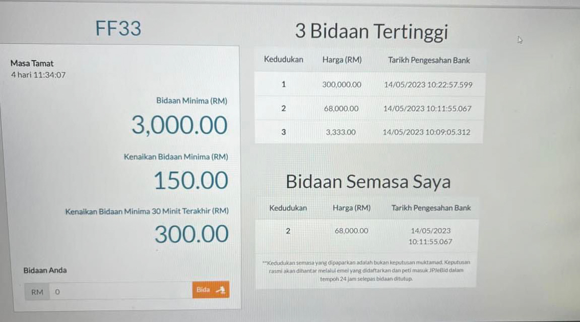 为了庆祝陆路交通局 JPJ 的 77 周年,因此他们在上个星期日就在 JPJeBid 系统上开放了联邦直辖区 Putrajaya 最新的 FF 系列车牌让民众参与竞标,而很多人也对这个车牌非常感兴趣,其中 FF 33 的号码在开始竞标的不到 1 天时间内,最高的竞标价已经去到了 RM 300,000 了,但是就有经营车牌销售业务的业者指出,其实在开放竞标前,当局已经提前锁定了多个号码,不让民众竞标。