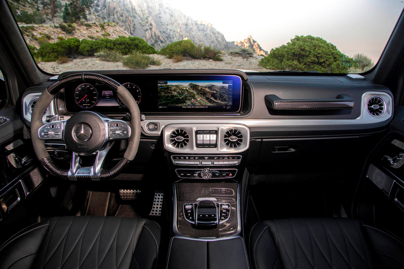内装部分,G-Class 经典三把锁当然是不会少的,这是因为这款车还是采用了非承载式车身结构,除了外观霸气之外,如果当你真的需要越野需求的话这款车还是可以满足你的。新一代的 G-Glass 内装设计结合了实用以及豪华,中控台上方具备了扶手可以供上下车/越野时候使用,但是它也拥有两个大尺寸的双联屏,完全展现独一无二的气质,不管你是谁,它都可以完全衬托出你的气质。