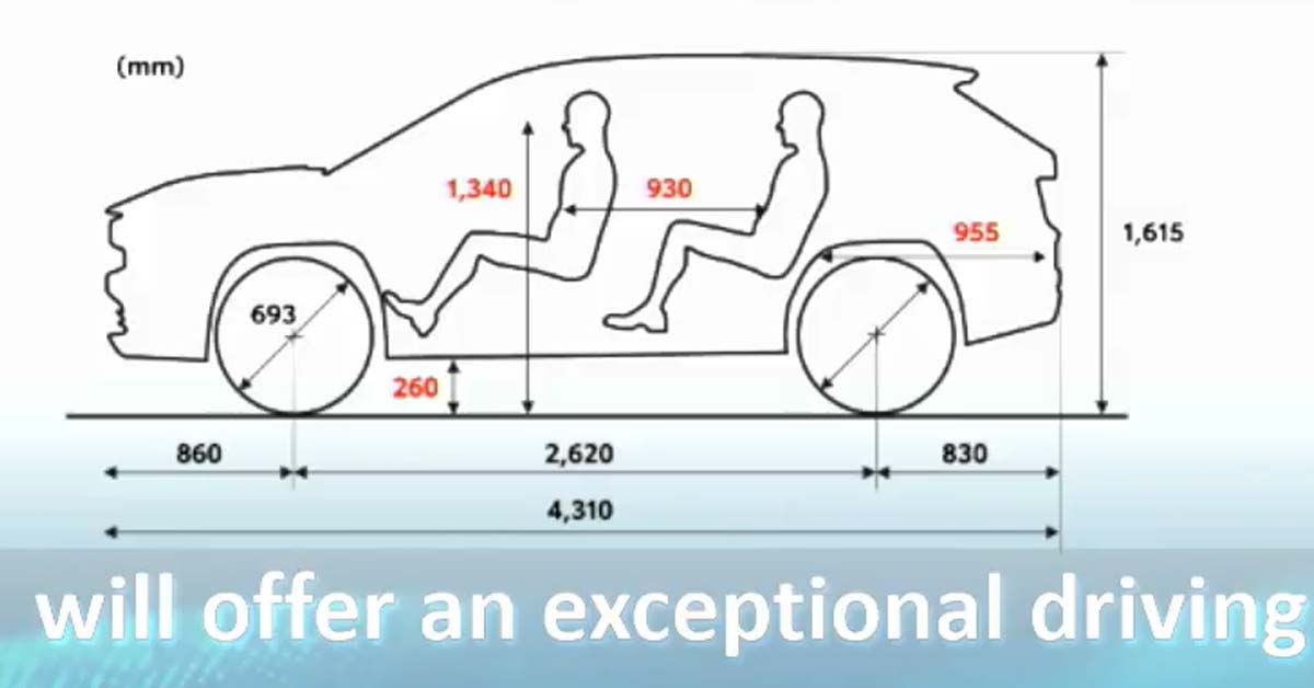 新车车身尺码:4,310 mm X 宽度不明 X 1,615 mm,轴距 2,620 mm(离地高度 260 mm,可以应付轻度越野路况)