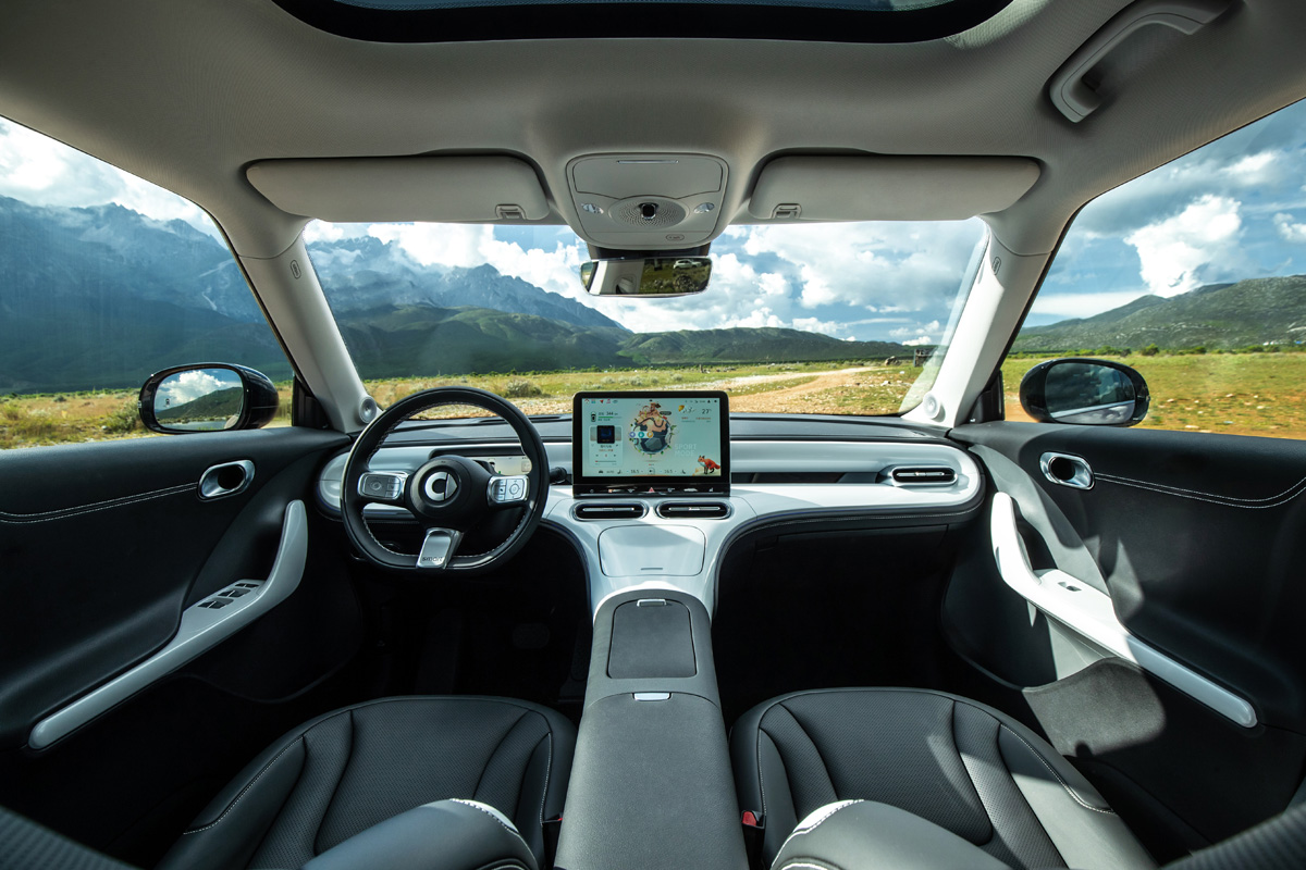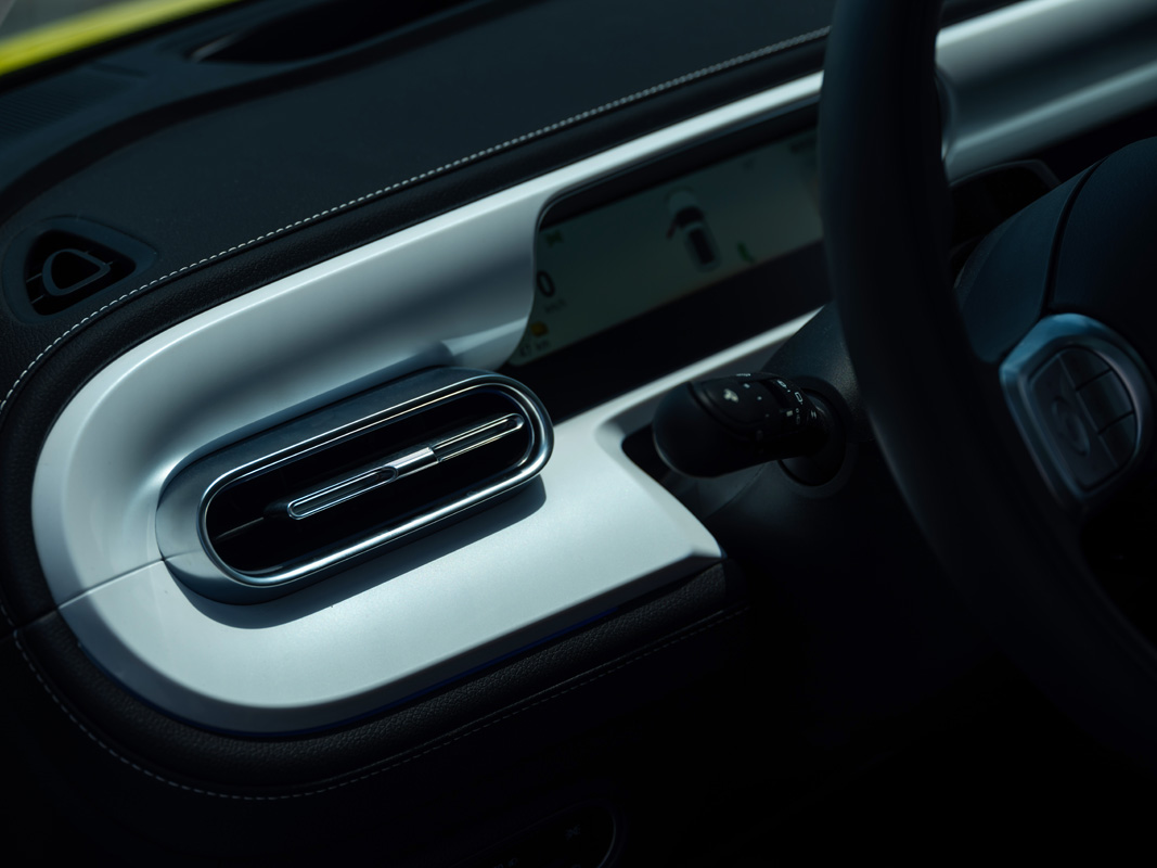 外观上这款车采用了较为圆润的线条造型,前脸可以看到椭圆的 LED 头灯组配上贯穿左右的日行灯条,而且虽然它是电动车,但原厂还为它保留了水箱护罩的设计,因此看上去并不会像一般的电动车那么突兀,另外隐藏式门把手和无框车门的设计,同时还有非常硕大的 “Styled by Mercedes-Benz”证明了它的血统,至于车尾则是一样有着贯穿式的尾灯,同时连贯了整车的圆润线条,让它看起来相当呆萌可爱。