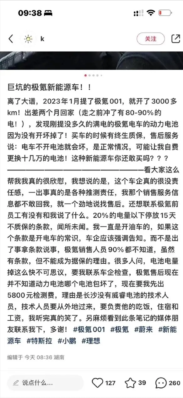 故事发生在中国,一位极氪001车主因为出差因此两个月不在家,但是在离开之前车子的电量还有80-90%,但是在两个月之后回到家车子已经完全没有电量,并且充不进电,因此车主联系了维修中心,不过问题在于电池已经损坏,在联系了厂商的售后之后发现电池已经不具备保固,因此厂方拒绝免费维修,这引起了车主不满,因为买车的时候厂方表示这辆车子是终生质保。