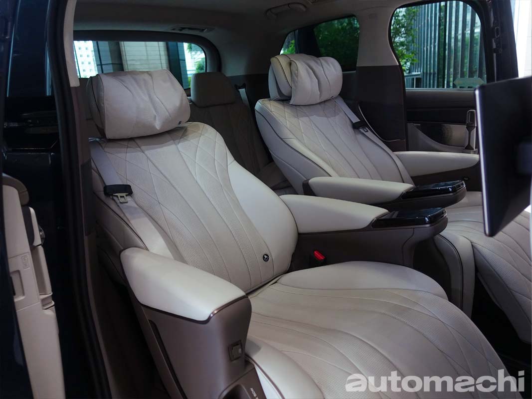 作为豪华 MPV 车型,这款车当然也不会忽略第二排老板的乘坐舒适性体验,它是 2 + 2 + 3 的 7 人座布局,中间是两张 Captain Seat 航空头等舱座椅还配备按摩功能,同时前排座椅后面还有两个 12.8 寸的显示屏加上全车 14 个 Dynaudio 丹拿 HiFi 音响可以给到乘客不错的影音体验,扶手上还带有触屏控制面板让你动动手指就能操控车内的一些功能。