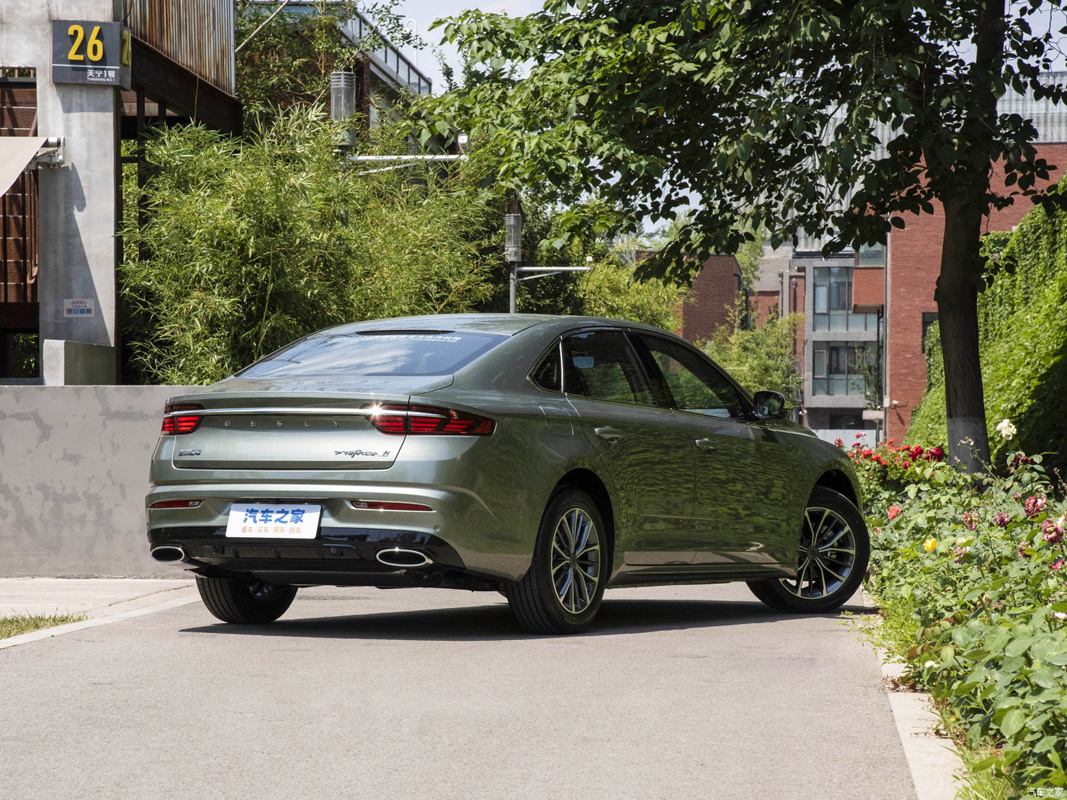 在外观的部分其实它和现款 2.0T 车型没有太大的区别,它有着直瀑式的水箱护罩设计加上外面一圈的镀铬饰条点缀,内置了黑色的吉利 Logo,配上方正的头灯组,以及整个棱角分明的前脸,让它看起来相当运动化,至于车侧则是 Sedan 修长的车身设计,而在车尾也没有太大改变,可以看到它的尾灯被一条镀铬饰条贯穿连接在一起,下方有吉利汽车和 PREFACE 的铭牌,不过它采用了椭圆双出排气尾管,因此让它的车尾看起来相当唬人。