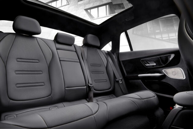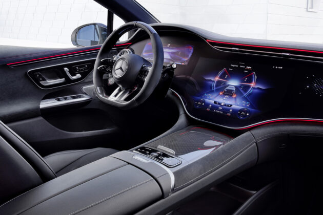 来到内装,这款车并不像现在大马贩售的普通版 EQE 是独立的全液晶仪表和 iPad 式触屏主机,它搭载了原厂科技感十足的 MBUX Hyperscreen 三联屏,另外作为 AMG 性能车款,整个内装也给到你十足的战斗气息,可以看到它有着最新的 AMG 双层式方向盘,并且带有经典的 Drive Select 旋钮,同时还有 AMG 运动皮革座椅,以及由 Alcantara + Carbon Fiber 碳钎维拼搭而成的内装饰板和材质,整个内装充分地融合了运动与科技感。