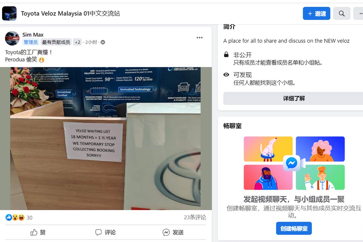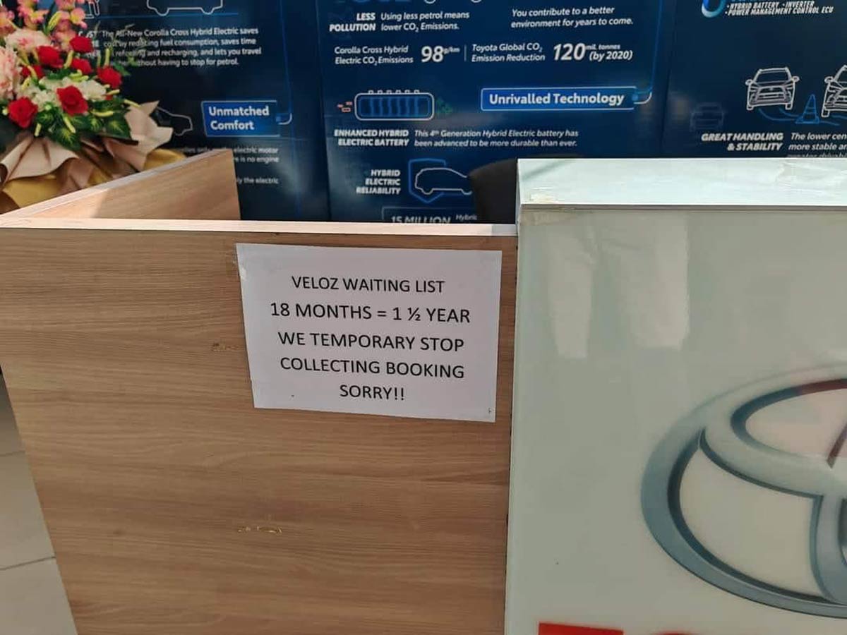 根据网友在社交媒体群组里公布的消息,相信他是在某一间经销商内的前台拍到的照片,在经销商前台就直接贴出一张纸显示 Veloz 的候车期长达 18 个月或是 1 年半,因此他们将会暂时停止接受新车订单,并对此表示抱歉,而这也就是说你现在订车的话,要等到 2024 年大约是 12 月才能拿到新车,真的是一个非常漫长的等待时间。
