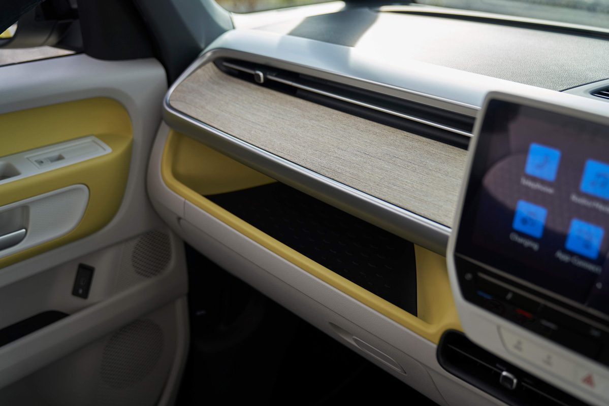 在外观上它致敬了经典的 T1 迷你小巴的厢型车设计,可以看到前脸有着和 T1 一样巨大的 Logo,同时 LED 头灯组也像是它的眼睛一样位列两旁,保险杠上也有菱形格纹的造型,加上 Dual Tone 双色车漆的衬托让它看起来复古的同时又很时尚,在车侧它就使用了侧滑门的设计,更方便在狭窄的地方上下车,而且在 D 柱还有扰流鳍的设计,可以优化车子的风阻系数,至于车尾则是上掀式尾门,有着细长的贯穿式尾灯,大 Logo 和 ID. Buzz 的字样,整体设计简洁流利。
