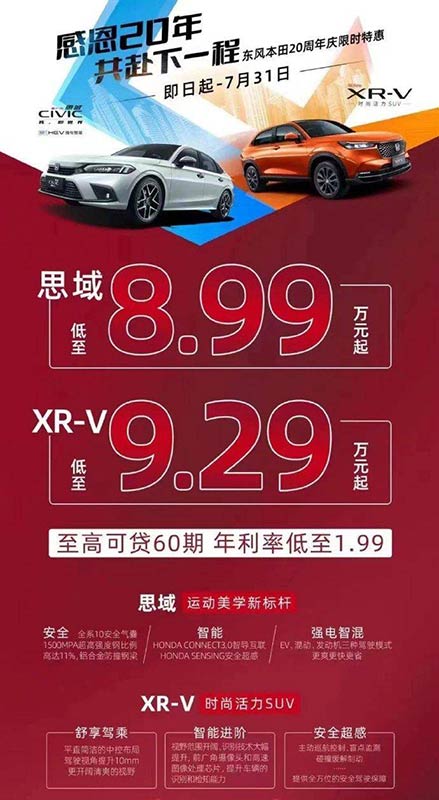 近日中国的 Honda 合资公司东风本田为了庆祝成立 20 周年,就在中国市场举行了 20 周年限时特惠,为旗下两款热门车型 Civic 和 XR-V(大马版 HR-V)推出大幅度优惠,在 7 月 31 日前新车售价直接优惠了整整 40,000 元人民币(约 RM 25,364)。