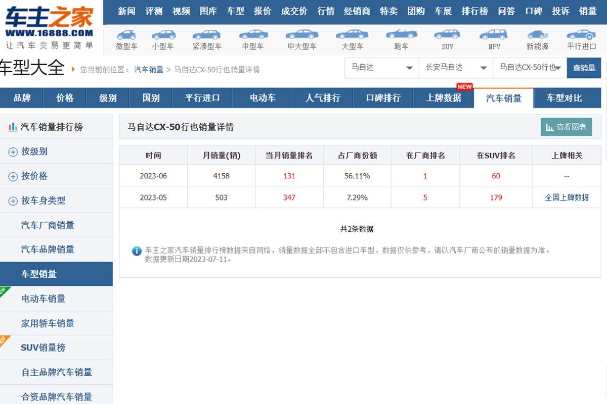 那 CX-50 这款车是在 4 月份在中国公布售价并开启预售的,之后在 5 月份正式上市,而根据中国市场的统计数据,它在 5 月份的单月销量仅有 503 辆,但是来到了 6 月份后就直接一举跃升至 4,168 辆,这款车的销量直接暴涨了 726.24%,并且单它一款车就占据原厂超过一半的销量,同时也让原厂今年首次在中国市场取得单月销量首次突破 7,000 辆的成绩,可见找对代言人是多么地重要。