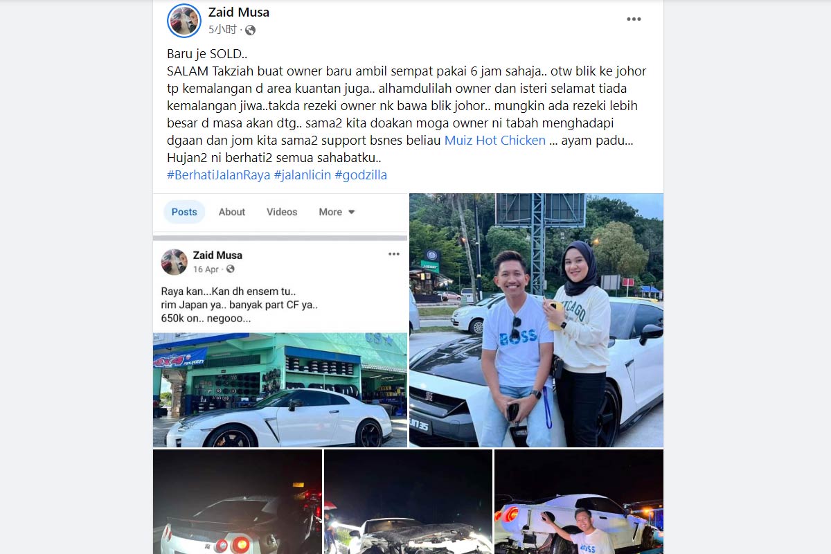 根据网友在社交媒体上公布的消息,近日有一位顾客在下午跟他买下一辆 Nissan GT-R R35 后就选择自己开回柔佛,岂料在靠近关丹时车子就不幸发生了意外,而前前后后自车主拿车开始算起也仅仅驾了 6 个小时而已,虽然网页没有说明是什么原因导致的车祸,但是可以看出照片中当时是下雨天,而且从网友贴文中的标签有写到 #jalanlicin,因此相信可能是因为雨天路滑导致车子打滑才会发生意外的。