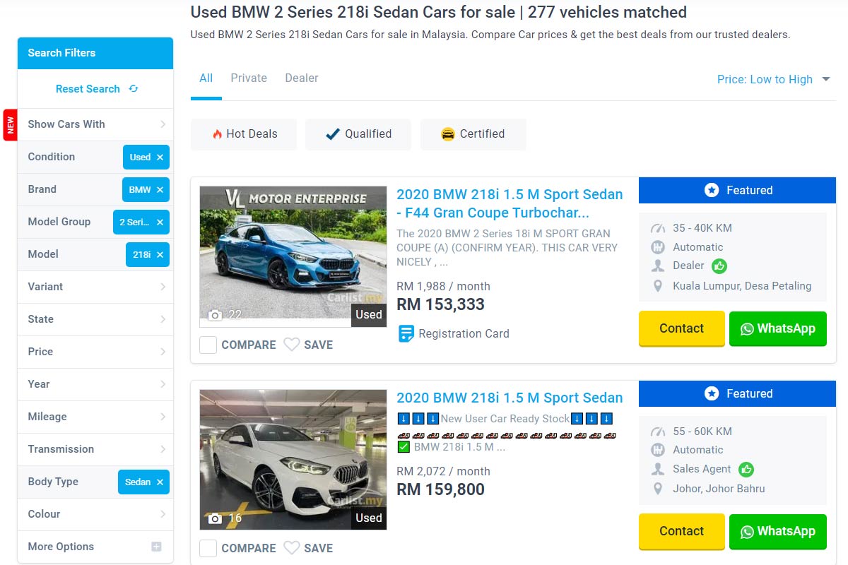 根据我们在网上找到的价格,目前 2020 年的 218i 最低的二手价是从 RM 153,333 起,不过就只有一辆而已,而再来就是 RM 159,800 会有比较多选择,不过值得注意的是,因为早几年 BMW Malaysia 的市场策略,当年部分的新车是只享有原厂只提供 2 年无限里程的原厂保固,想要长达 5 年的原厂保固就需要额外花钱选配,也就是说如果你是买到 2020 年的车子的话,你的车是已经没有 Warranty 了的(除非前车主有加价选配延长至 5 年的原厂保固),如果你很介意车子有没有保固的话,在买车之前最好先事先和车商确认这个事情。