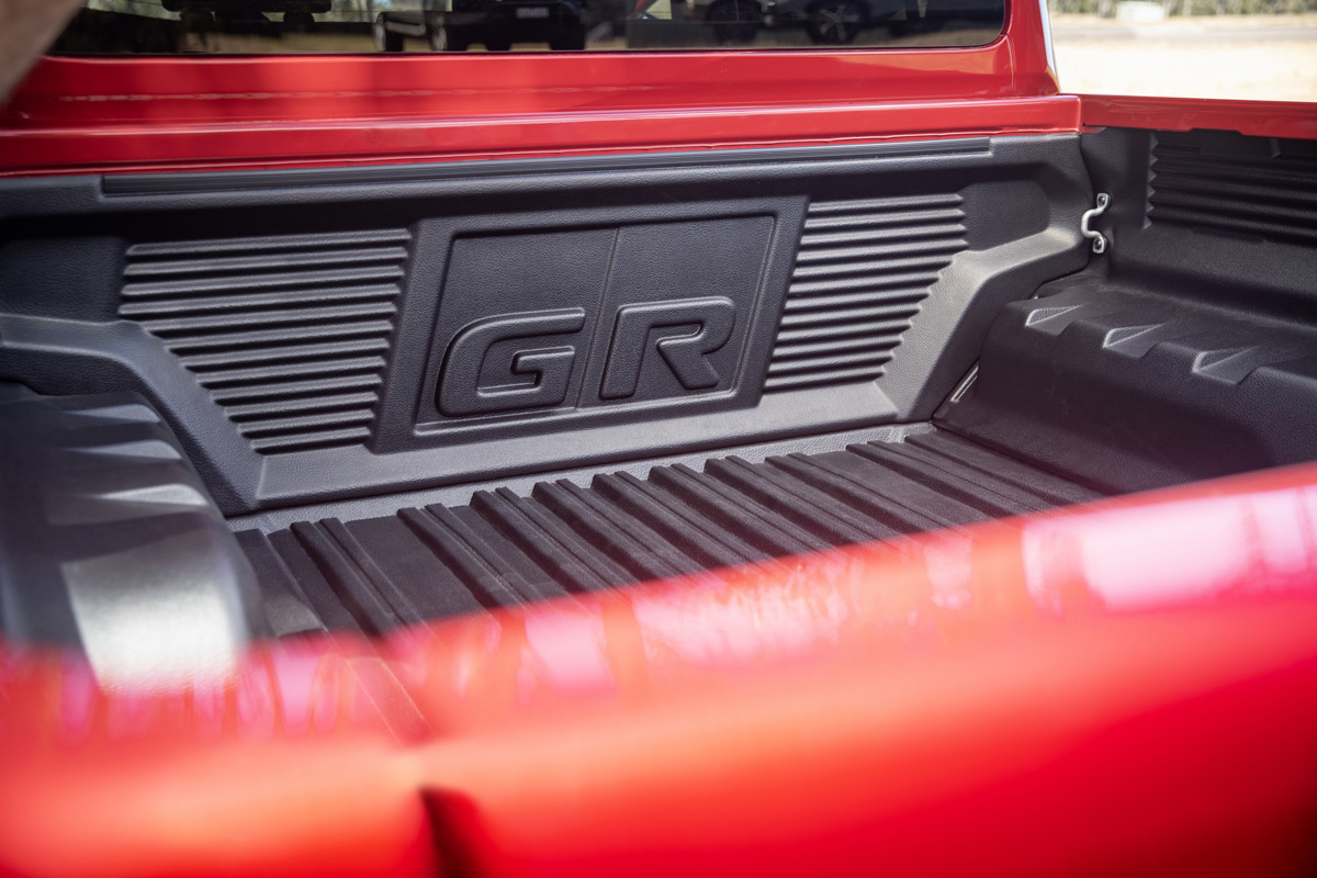 外观上这款车延续了 Pickup Truck 该有的霸气风格,在车头上它并不是传统的丰田 Logo,而是被换成了 TOYOTA 几个字母,至于水箱护罩上有 GR 的徽章,同时外围有一圈亮黑色的包围,而在保险杠上可以看到有更运动化的设计,下方还有雾银色的护板,至于在车侧可以看到它的轮拱用了黑色的 Widebody 宽体塑料防刮材质,不过对比起当地的 Hilux Rogue 和 Hilux SR5 采用的 18 寸轮圈,据悉为了更好的越野性能,因此它仅使用 Dakar 达喀尔造型的黑色 17 寸轮圈配 Bridgestone Dueler AT 全地形轮胎,同时里面有红色的四活塞刹车卡钳(前轮),而在车尾仅多了一个 GR 徽章,并没有明显不同。