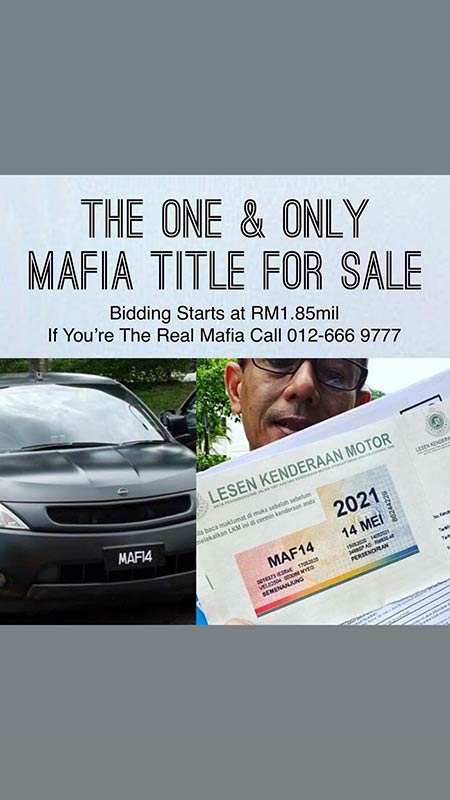 根据他在个人社交媒体上所释出的的照片,他的贴文就放上了标题“Are you The Real Mafia in Malaysia? Call Lah Kalau Berani….”(你是不是大马真正的黑手党,够胆你就打过来),另外在他的照片里就附上了他和 MAF 14 车子路税的合照,证明他就是这个车牌的所有人,并且照片上附上标题 “The One & Only Mafia Title For Sale, Bidding Starts at RM 1.85mil, If Your’re The Real Mafia Call 012-666 9777”(唯一出售的黑手党称号,起标价 RM 1,850,000,如果你是真正的黑手党请致电 012-666 9777)。