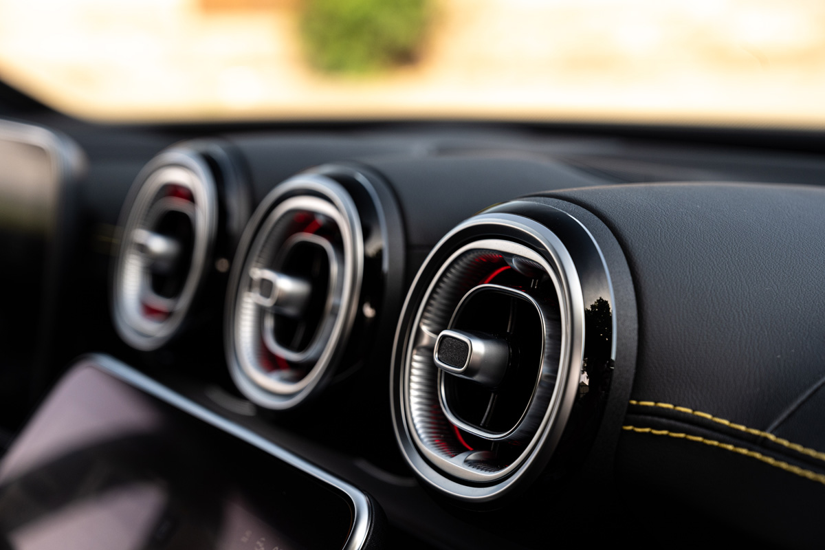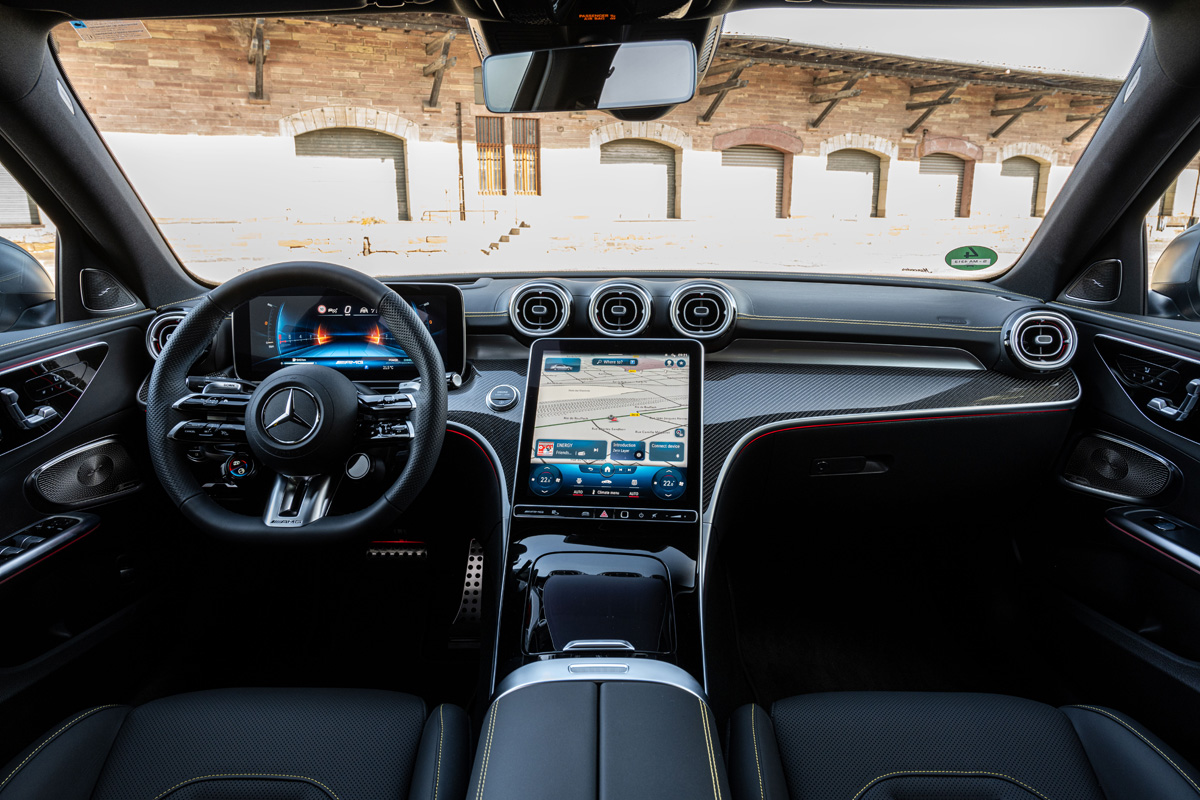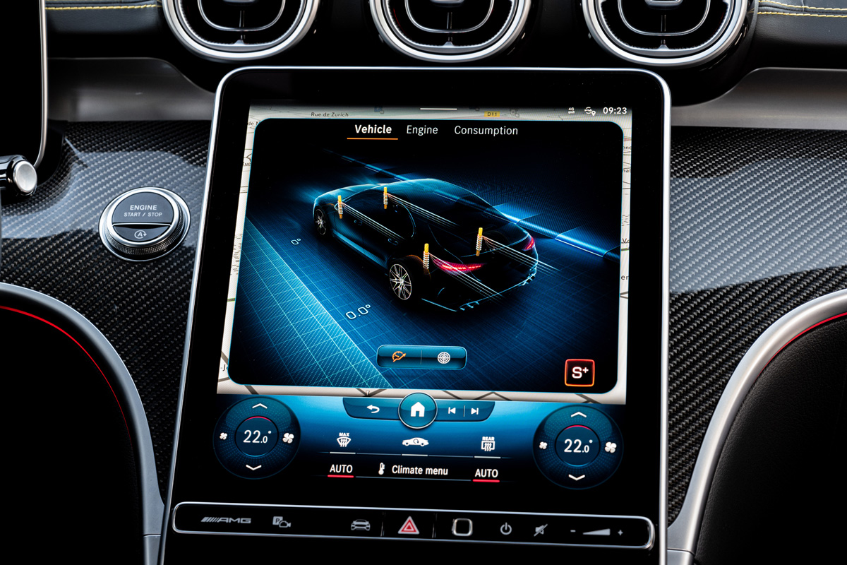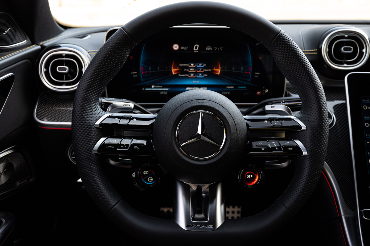 来到内饰就基本上还是 C-Class 的设计语言,最明显的 12.3 寸悬浮式全液晶仪表和 11.9 寸触屏主机还是能在这台车内看到,不过原厂还是为它加入了 AMG 专属的设计,包括赛车桶椅,带有旋钮控制的方向盘,红色车内缝线和碳钎维的饰板无一不在诠释着这辆车的性能。而和其他较高级的 AMG 车款一样,方向盘的旋钮能让你调整悬吊软硬,切换驾驶模式等等。