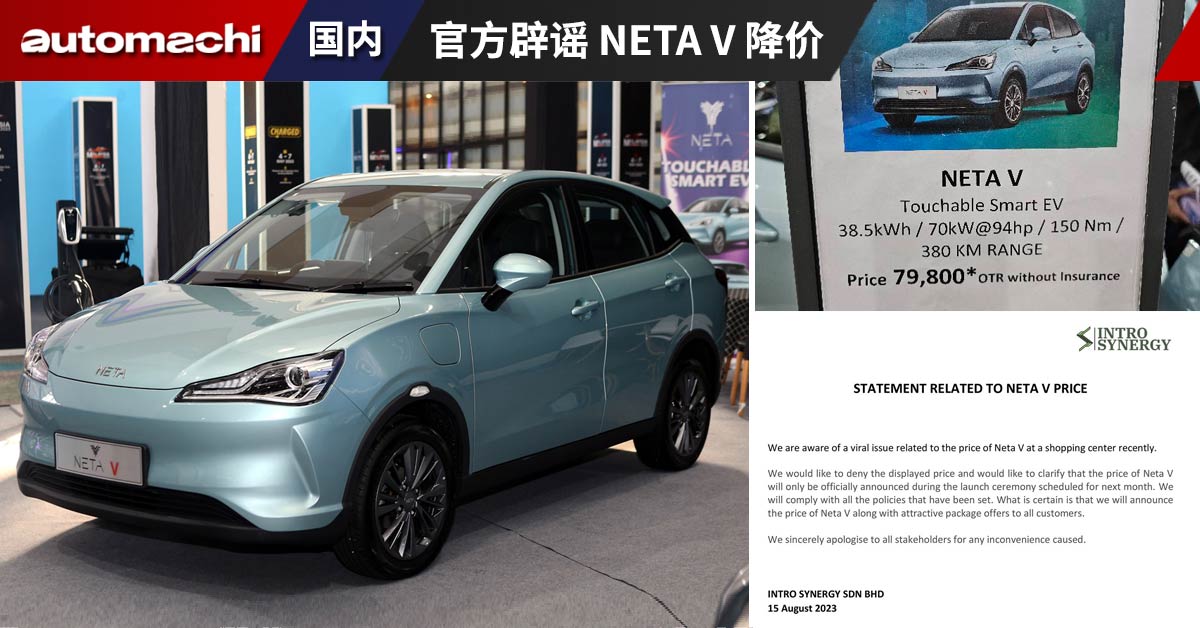 网传 Neta V 降价 RM 20,000,开价 RM 79,800 起,成大马最便宜电动车。官方:消息不准确,请静待后续公布。
