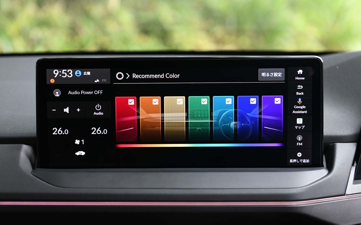 不过等待还是值得的,首先根据日本的官图我们可以看到当地的 Accord 虽然在外观设计部分和北美以及中国版一样,但是内装设计则是完全更换了新设计,首先就是在排挡杆基座、中控台以及门板部分设置了能够企鹅换颜色的氛围灯,中央的娱乐主机也变成了宽屏的设计,最重要的是中央的冷器控制旋钮变成了圆形的液晶荧幕,可以显示冷气等等的资讯,非常的酷炫。