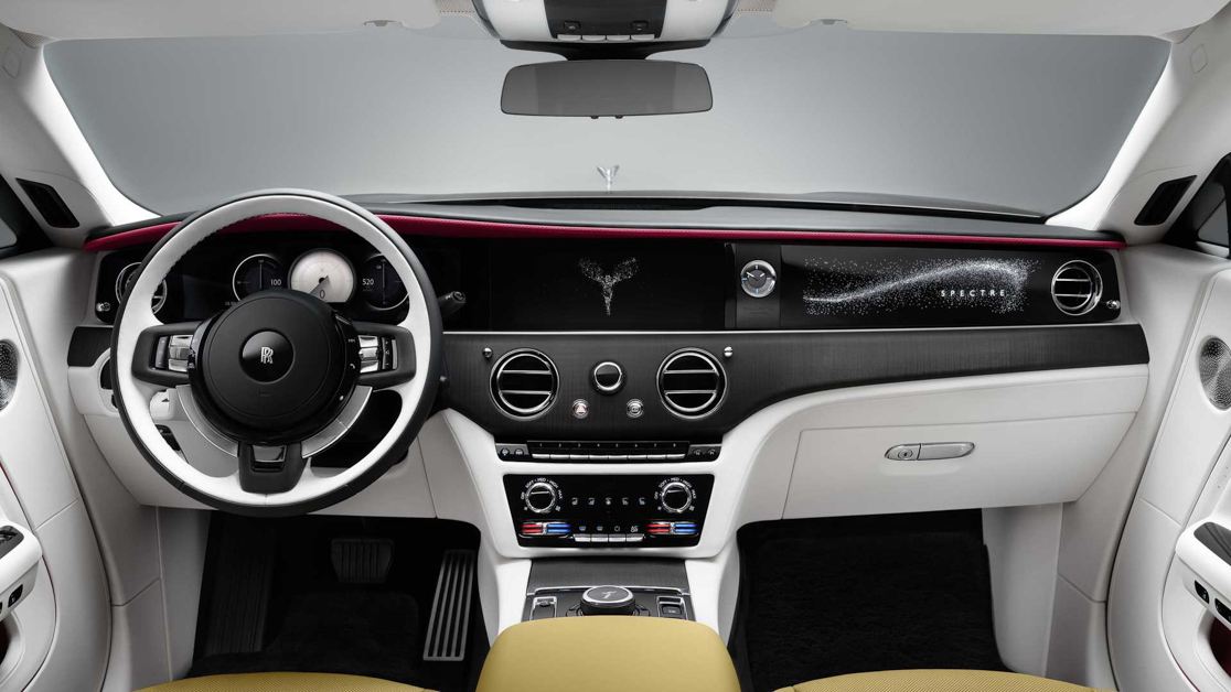 来到内装如果只关注在屏幕大小绝对是对这辆纯手工打造的劳斯莱斯的不敬,因为科技重来都不是原厂关注的点,他们关注的是怎样给到车主一个豪华、奢华及舒适的驾驶和体验,像是原厂会在车内设置星空顶,投入超级多的隔音材料等等,其中它的内饰必须一提的就是耗费了工匠很多心血打造副驾驶前方的星光饰板(Illuminated Fascia)耗时超过 10,000 小时进行研发,在这个饰板内将由很多的星星围绕着 Spectre 字标,另外在门板上也有星星,加上车顶的星空顶,全车有超过 11,000 颗星星熠熠生辉。