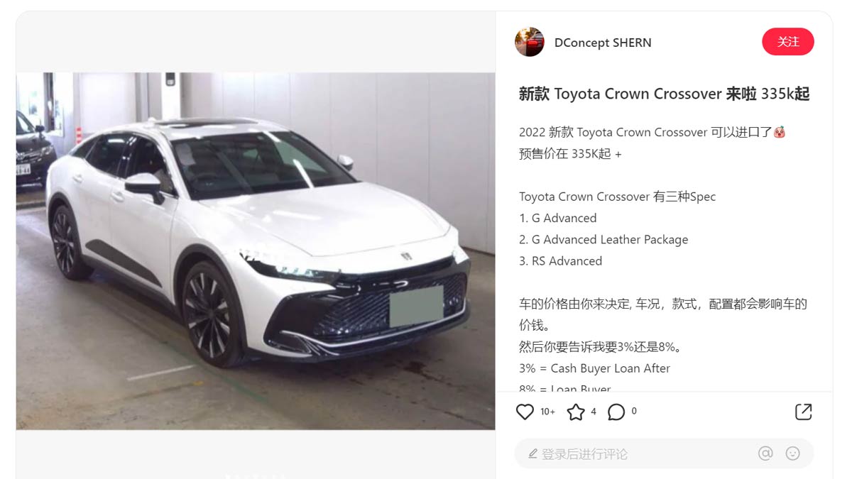全新第 16 代 Crown 是在 2022 年 7 月 15 日全球首发,而算算时间如果是第一批在日本当地交付的 Crown Crossover 其实已经可以满足我国 AP 入口准证进口车龄最少 1 年的复新二手车的规定,那本地著名进口车商 DConcept 的一名销售员近日就在社交媒体上开放这款车的预订,这款车引入大马的预计售价从 RM 335,000 起。