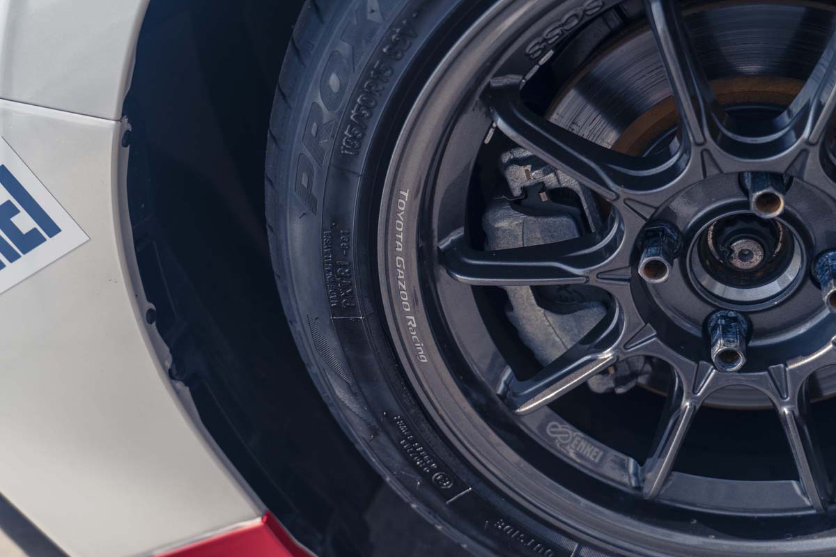 再来就是车辆进行了极致的轻量化,基本上车上无用的用品,如车顶的隔板、后座椅,甚至连触屏主机都被拆掉,至于在轮圈的部分也是采用了正品的 Enkei 15寸轮圈,匹配了 TOYO 提供的 TR1 轮胎。另外车辆也增加了全车的防滚笼,除了可以在发生情况的时候保证赛车手的安全,也可以提升车体的刚性让车辆的表现更好。