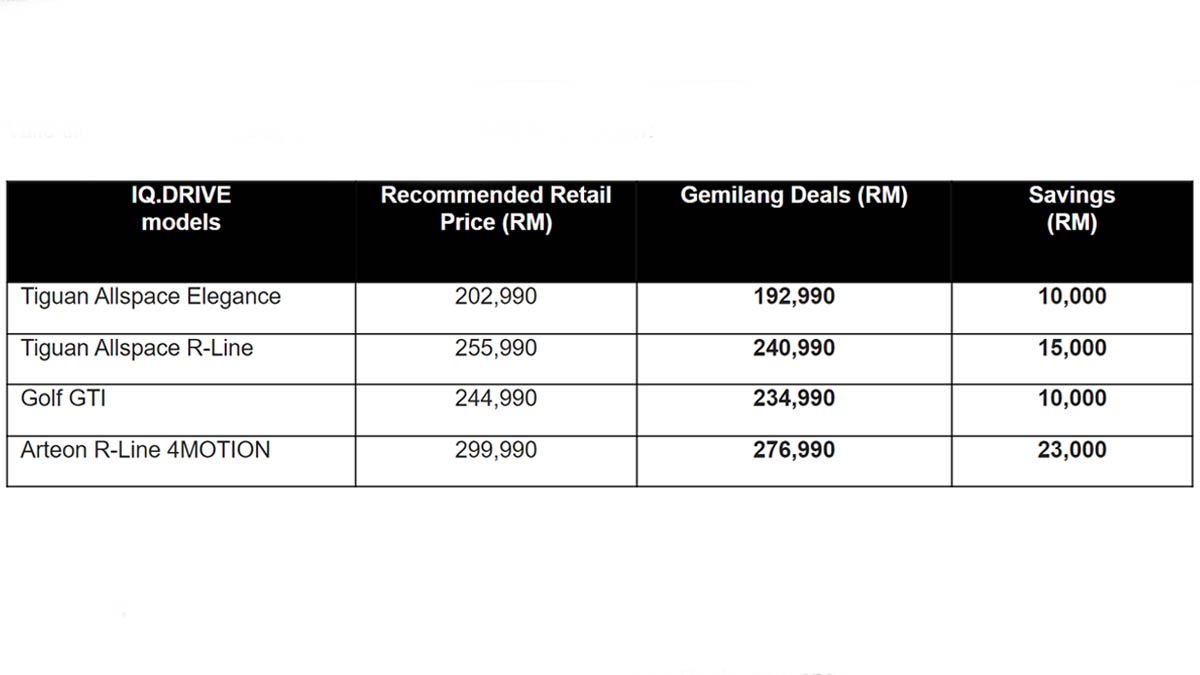 为了配合国庆日和马来西亚日的到来,原厂就推出了 Gemilang Deals 限时优惠活动,为旗下几款带有 IQ.DRIVE 的热销车型带来介于 RM 10,000 – RM 23,000 之间的限时折扣,这次的优惠除了目前售价最便宜的 Tiguan Allspace Life 车型和已经开放预订但未公布正式售价的 Golf R 外,原厂旗下的 Tiguan、Golf 和 Arteon 各个车型都有不同程度的优惠折扣。