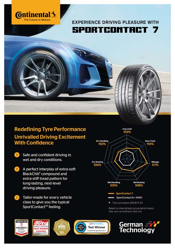 那全新的 SportContact 7 已经正式在我国发表,它有着 50 个不同的轮胎尺寸选项,里面涵盖了 18 – 23 寸等多种不同的尺寸,并且它可以适配在 Mercedes-Benz、BMW、Audi、MINI 及 Maserati 等等车款,它从即日起在全国的 Continental 轮胎经销商那里都能买到,如果你有兴趣了解更多详情,可以到 www.continental-tyres.com.my 去查询更多关于这款轮胎的消息。