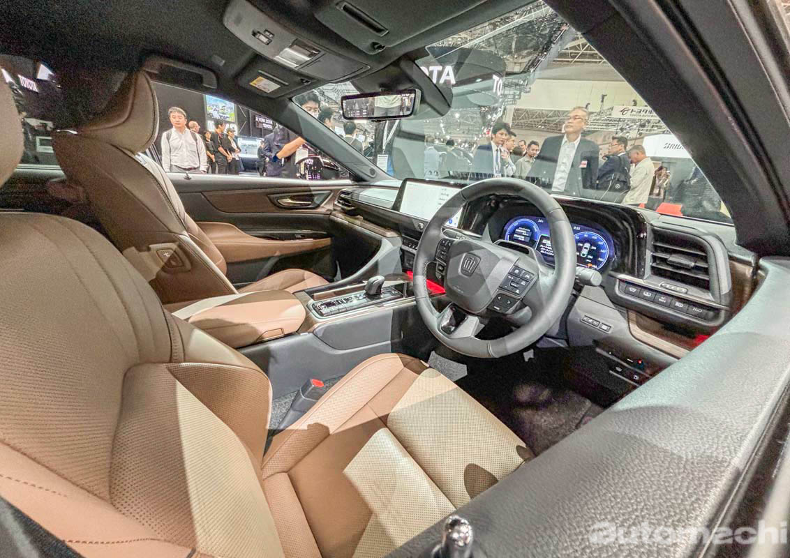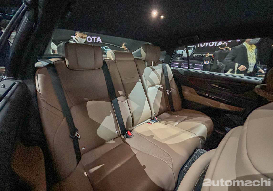 至于内饰它就和已经发布的 Crown Crossover 及 Crown Sport 大同小异,有着 12.3 寸全液晶仪表及 12.3 寸中控触屏主机,并且它有着电子排挡杆、Drive Mode 驾驶模式切换和电子手刹车等等的配备,不过它在原本出色的内装质感基础上,用上木纹饰板,让它看起来更加高贵典雅。那作为一款更注重后排的空间及体验的老板车,我们可以看到虽然是 5 人座设计,但是后排中间是可以放下来变成扶手的,同时腿部的空间也相当宽裕。