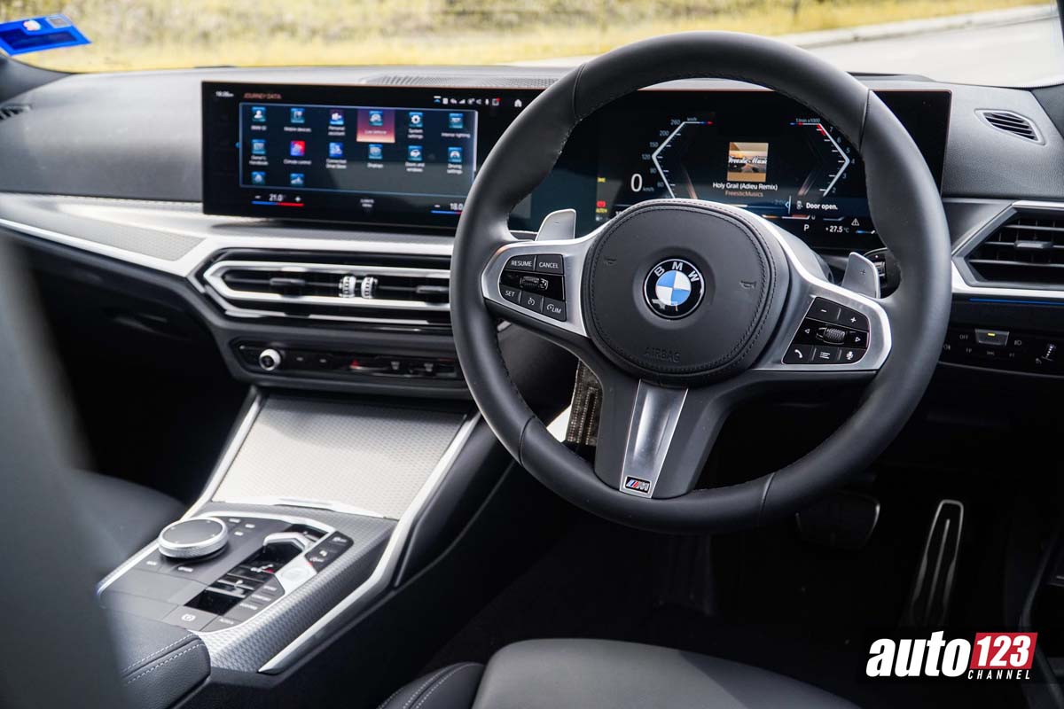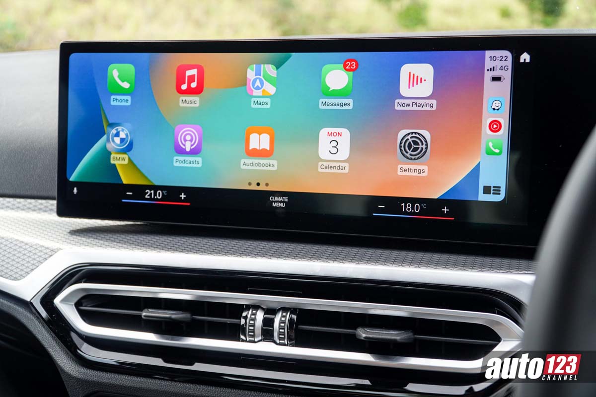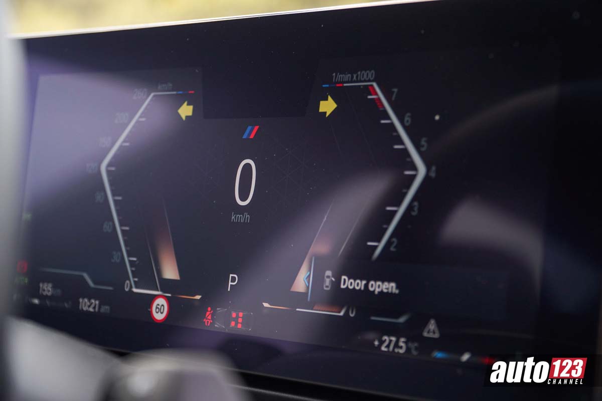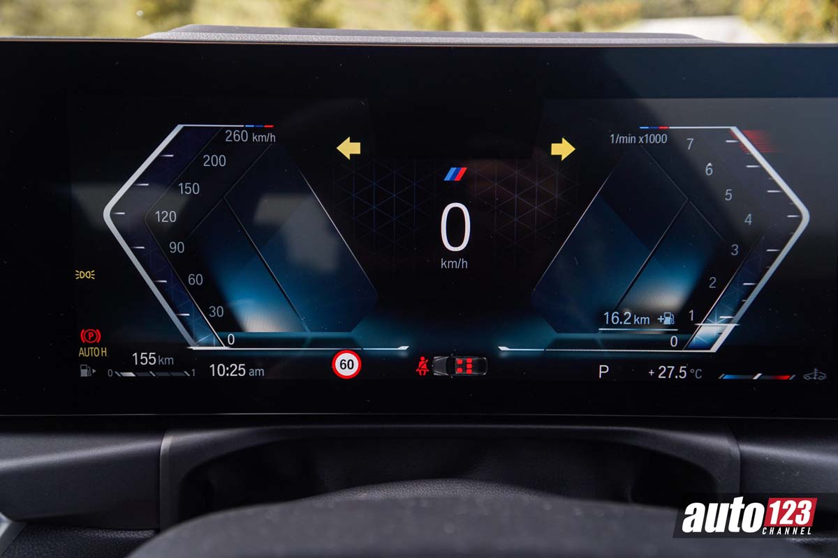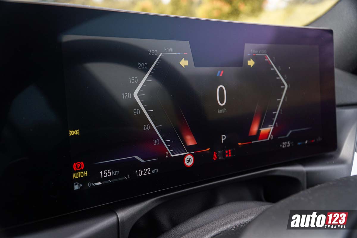 来到了内装,这款车换上了最新的家族式双联屏设计,有着 12.3 寸全液晶仪表 + 14.9 寸中控触屏主机,并且内置的系统是新的 iDrive 8.0,整体使用上更为智能,同时它也标配了 Android Auto 和 Apple CarPlay 功能,另外这个内装也有着造型小巧的拨杆式挡把,同时配备 Paddle Shift 换挡拨片,让你时刻可以根据需求来切换挡位,另外它还有 HUD 抬头显示器,整体的配备在这个级别几乎是无可挑剔的。