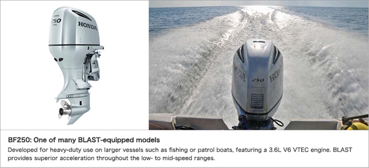 除了汽车引擎,本田也有生产适合小型船只使用的引擎,小至 2 Hp 到最大的 250 Hp,他们共有 20 种引擎能够搭载在各类船只上,并且依靠 PGM-Fi(Program Fuel Injection),VTEC,稀薄燃烧控制和强化低速扭矩等新技术,使得他们的引擎比对手更省油,更有利,也更好地满足了各国的排放标准。