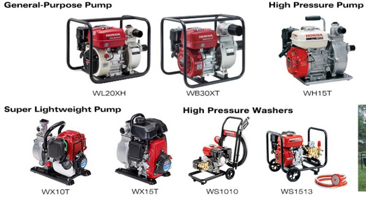 本田设计的水泵被广泛应用在农场,建筑工地,水灾时和干旱地区等,因为它能够快速有效地将水传送至地势较高的地方,或在水灾地区发挥快速排水的功能而闻名。他们的水泵搭载经典的 GX 系列引擎,可以有很好的耐用度和很高的使用效率,除此之外,他们生产的汽油喷水器也广泛应用于工业和清洁用途。