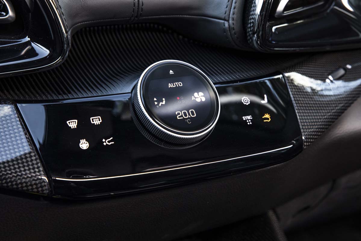 来到内饰的部分,这款车是一辆四座的定位,而内饰是一贯法拉利的运动风设计,全液晶仪表配上集成大量控制按键的方向盘,一切都是以极致的驾驶乐趣为首要需求,另外在中控台部分是这款车的触控式冷气控制面板,同时在副驾驶的前面还有一个显示屏,可以显示车子的时速、转速、驾驶模式等基本的信息,基本上整辆车很好地兼顾了豪华和运动氛围。
