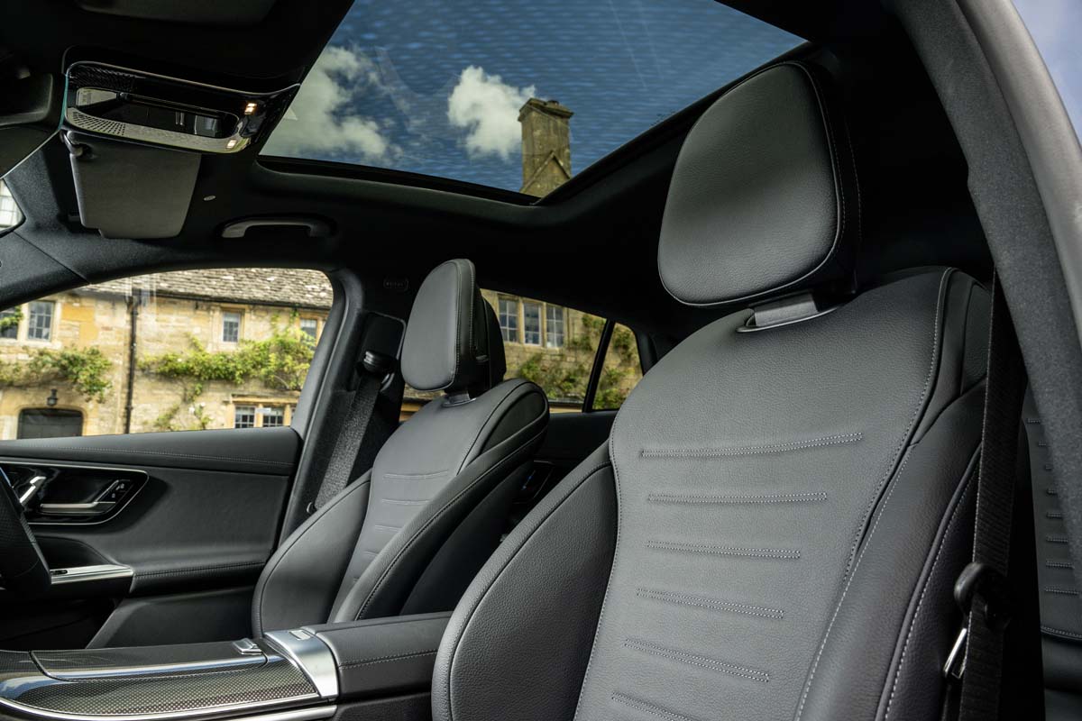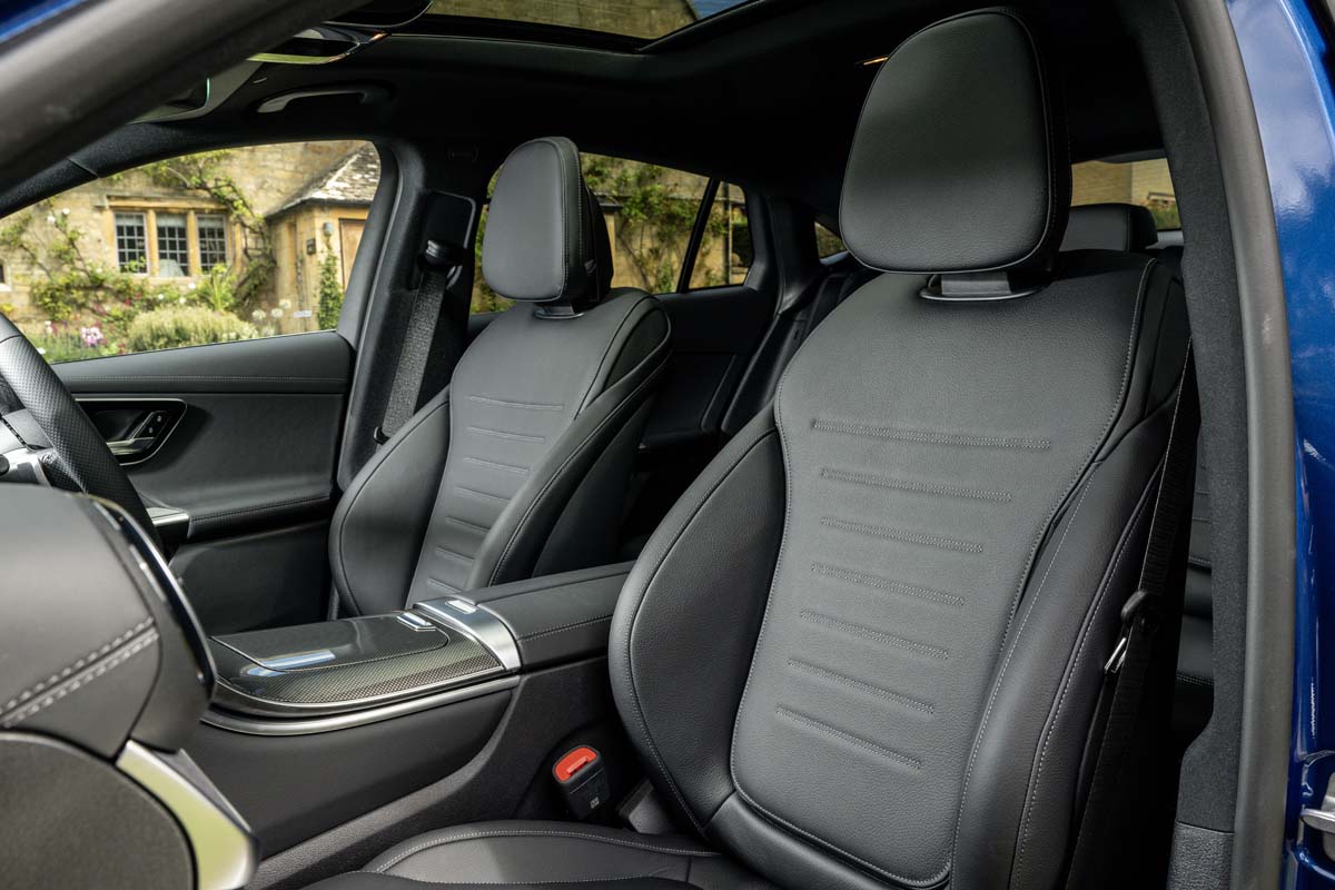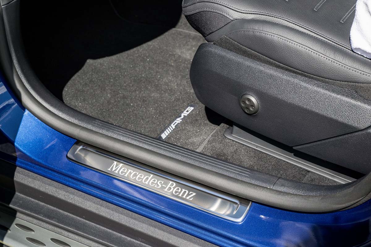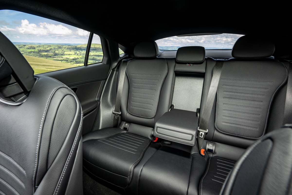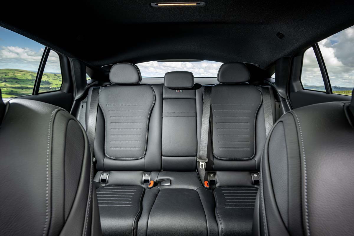 来到内饰的部分,这款车用上了原厂最新的家族设计语言,包括了 12.3 寸全液晶仪表和 11.9 寸 MBUX 触屏主机,可以支援 Apple CarPlay 和 Android Auto 连接功能,并且它还有 360°全景影像,另外它还有原厂著名的 64 色氛围灯设计,晚上开车氛围感十足,同时它的 AMG Line 方向盘和 Paddle Shift 换挡拨片可以带给你更出色的驾驶乐趣,而且就算是有着大流背的设计,后排看起来头顶空间依然算是宽裕,其余配置像是手机无线充电面板和 Burmester 3D 高级环绕音响等等都能在这款车上看到。