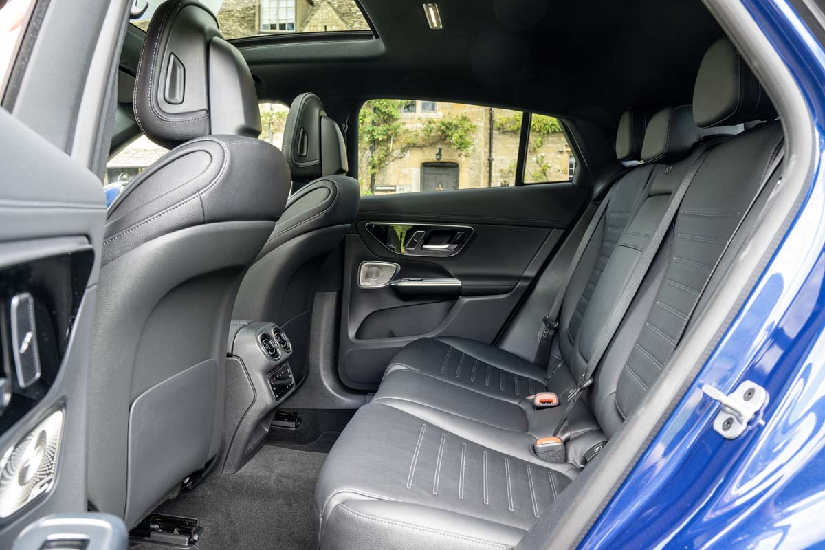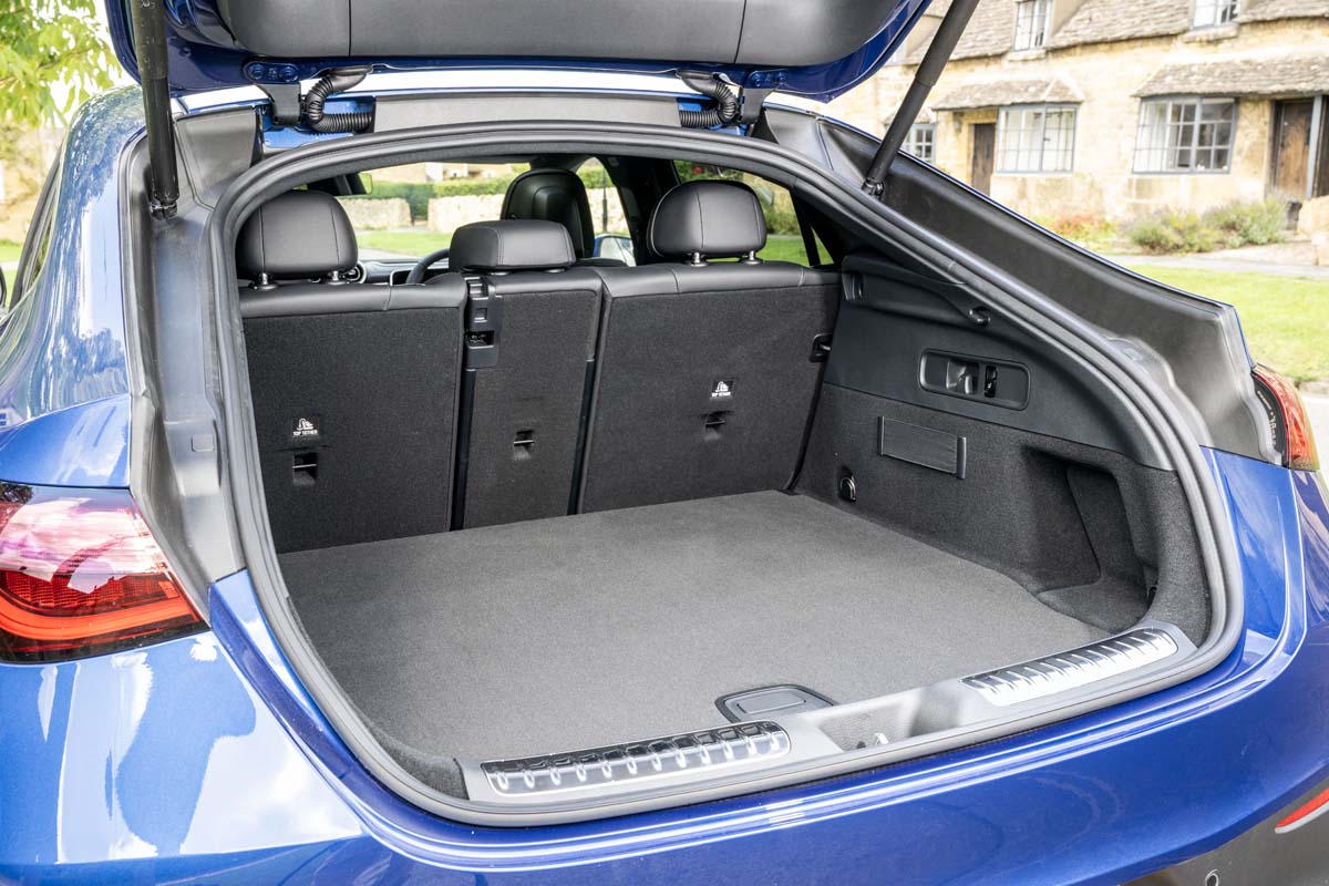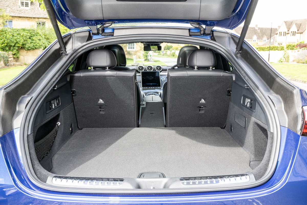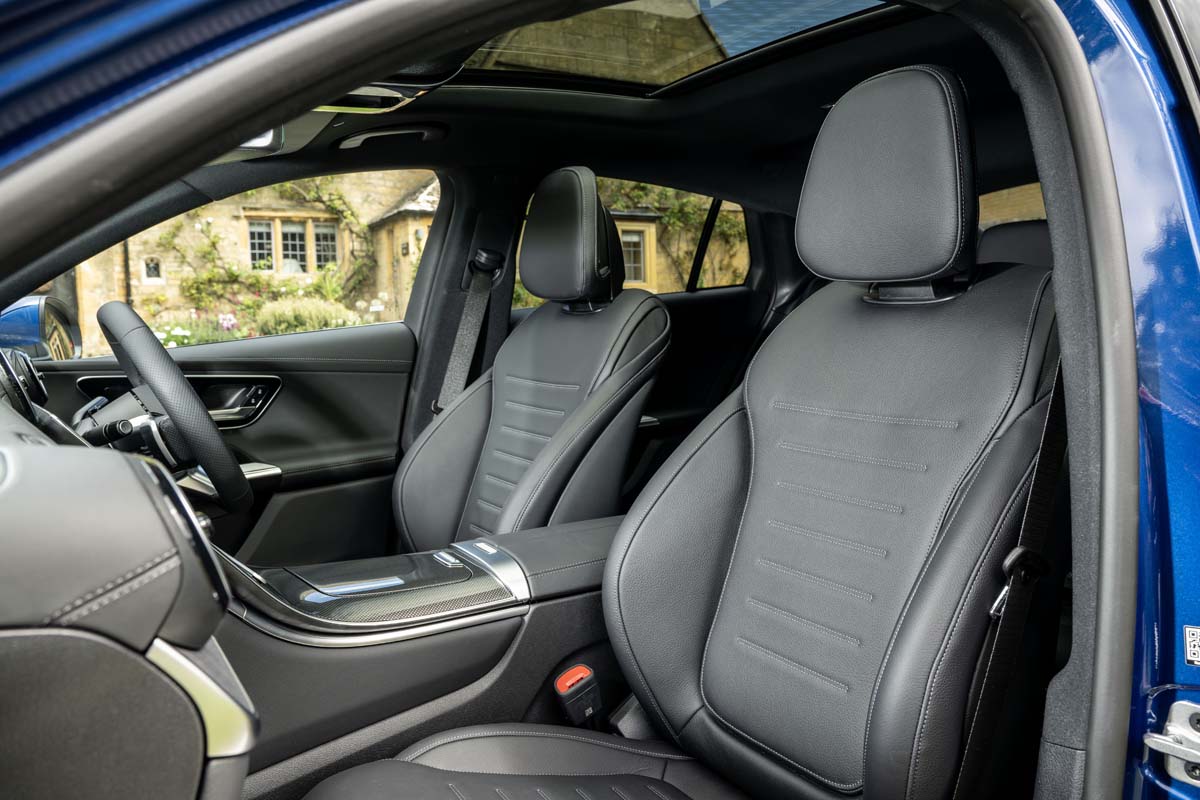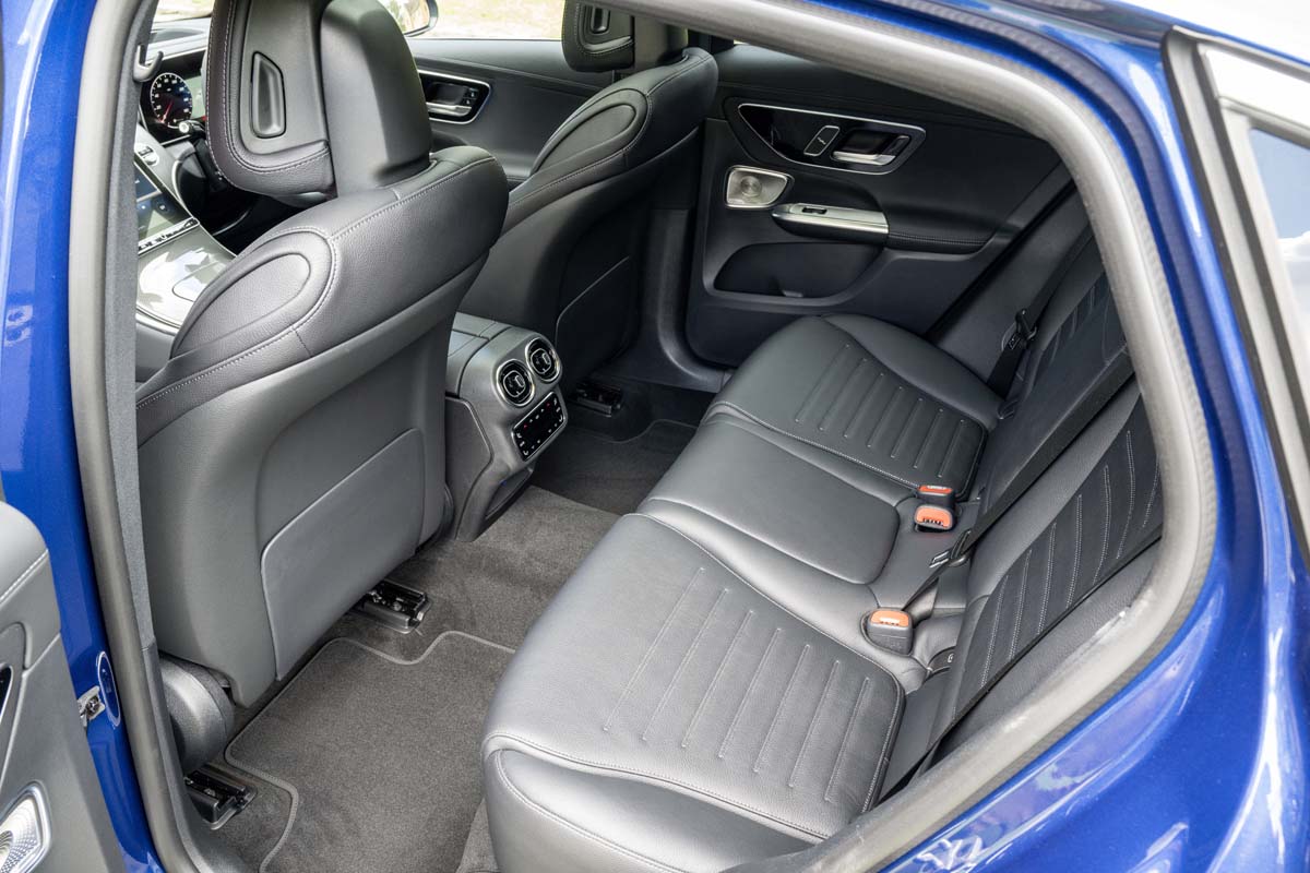 来到内饰的部分,这款车用上了原厂最新的家族设计语言,包括了 12.3 寸全液晶仪表和 11.9 寸 MBUX 触屏主机,可以支援 Apple CarPlay 和 Android Auto 连接功能,并且它还有 360°全景影像,另外它还有原厂著名的 64 色氛围灯设计,晚上开车氛围感十足,同时它的 AMG Line 方向盘和 Paddle Shift 换挡拨片可以带给你更出色的驾驶乐趣,而且就算是有着大流背的设计,后排看起来头顶空间依然算是宽裕,其余配置像是手机无线充电面板和 Burmester 3D 高级环绕音响等等都能在这款车上看到。