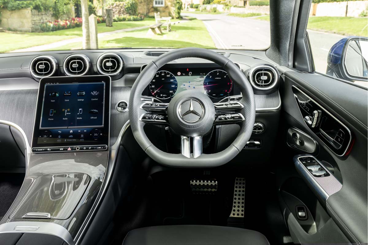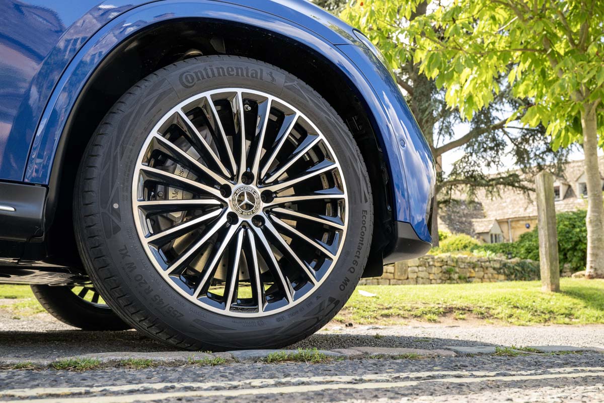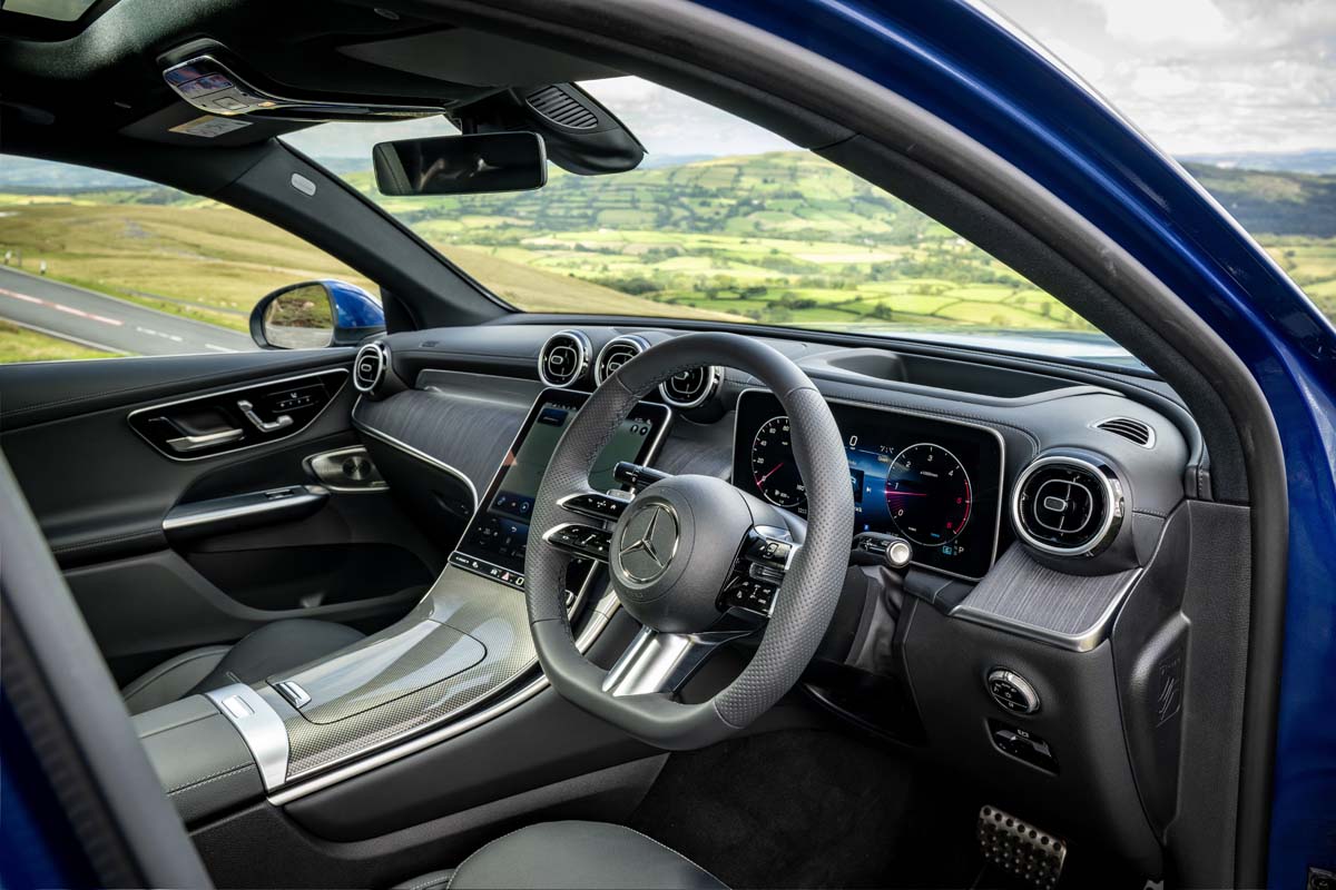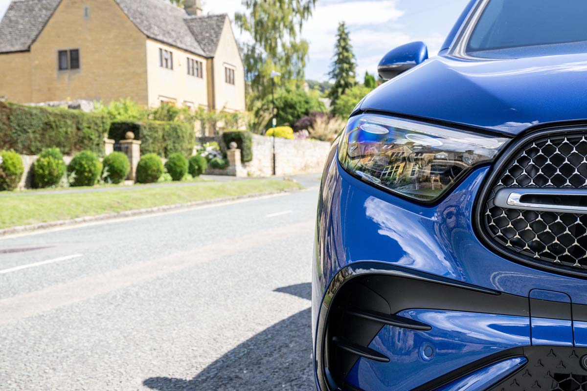 在外观上可以看到这款车是采用了和新一代 GLC 一样的外观设计风格,它走的比较豪华稳重的设计,同时又不失运动感,相当好看,它在整车的设计多是圆润的线条,在它的前脸上有着造型硕大的水箱护罩,里面的三芒星奔驰 Logo 被一条刀片式的横条贯穿,同时里面有 AMG Line 独有的满天星设计,至于两侧则是 DIGITAL LIGHT 的 LED 头灯组,而在保险杠上就有更运动化的设计,整体造型相当 Sporty,另外在车侧就是大气平稳的线条设计,加上 20 寸的多辐式轮圈,而车尾就是它和 GLC 最大的不同,它有一个超级好看的溜背式造型,让它看起来更加运动化,同时它的下方保留了排气管设计,能在电动车流行的时代一眼看出不同。