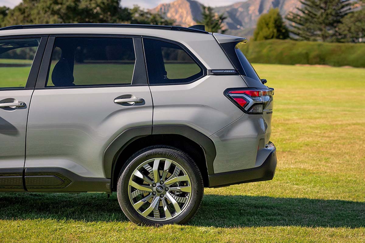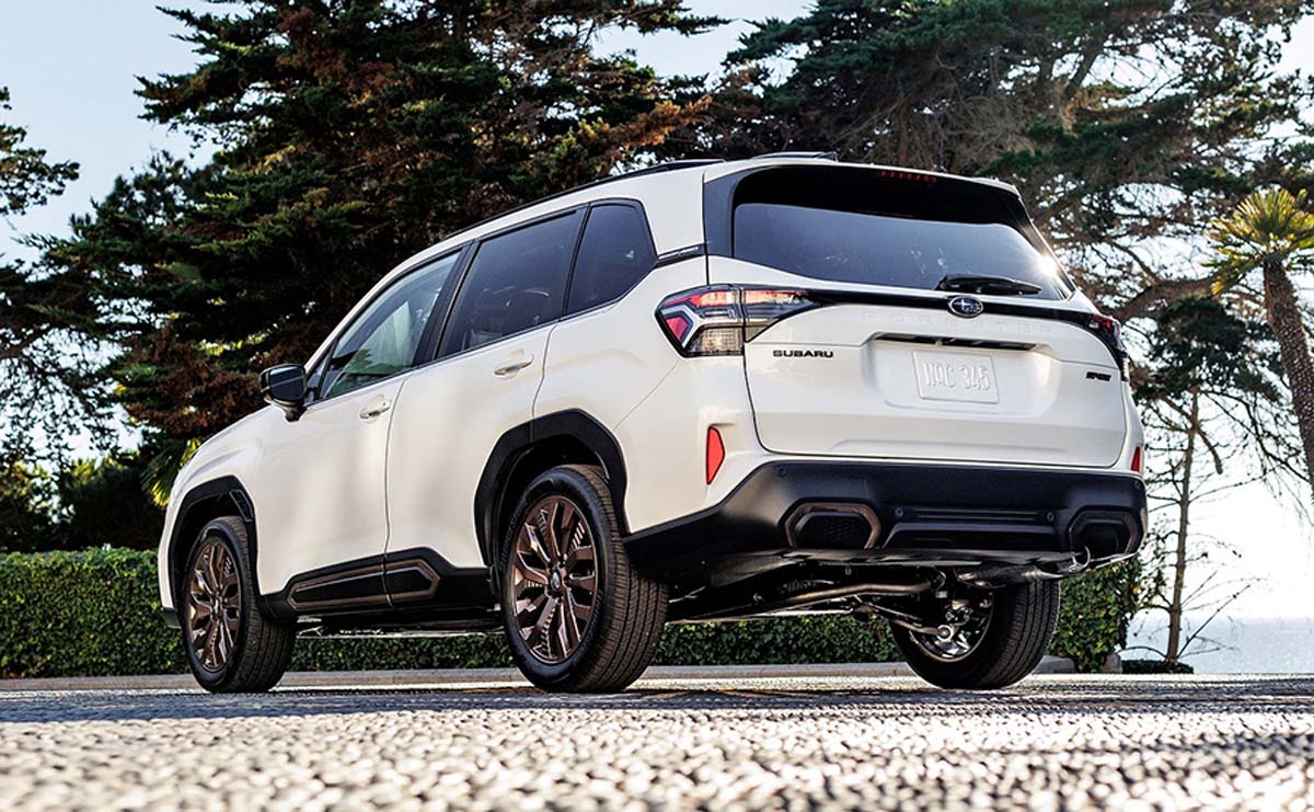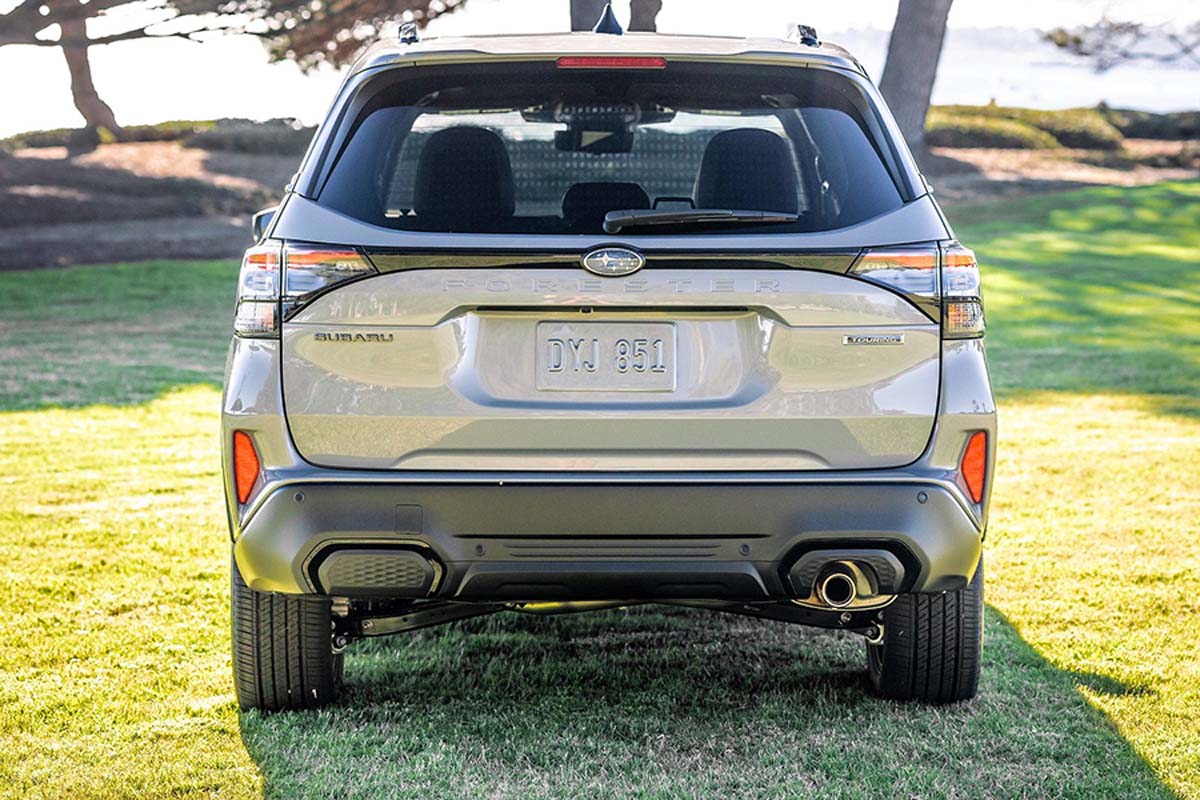 来到车侧的部分,虽然线条平整,不过可以看到在前后轮拱有微微的宽体设计,同时为了突出 Crossover 的跨界风格,它的车身下沿也有黑色的塑料防刮材质点缀,至于在车尾的部分,它一样是采用简洁的设计,可以看到在厂徽的下方有 FORESTER 的字样,同时还有小巧的尾灯组,而在下方可以看到留有左右两边的排气尾管开口,但这一次的官图仅有右边有排气尾管。