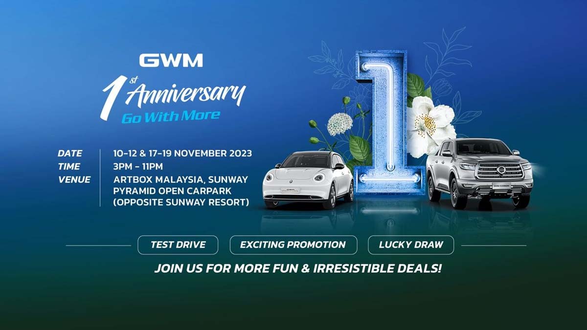 2022 年 11 月来自中国的长城汽车正式在我国导入旗下首款新车欧拉好猫,而适逢一周年之际,为了感谢本地消费者对于他们的大力支持以及关注,原厂在今年 11 月就举办了多项活动来庆祝这一重要时刻,首先他们会和 ARTBOX 合作在 11 月中旬连续两个周末在 Sunway Pyramid 举办 #GoWithMore 活动,大家除了可以在活动中看车/订车之外,只要莅临位于 Sunway Pyramid 的 ARTBOX GWM 展位既有机会参与幸运抽奖,奖品包括 RM 2,000 的现金卷以及 GWM 周边产品等等。