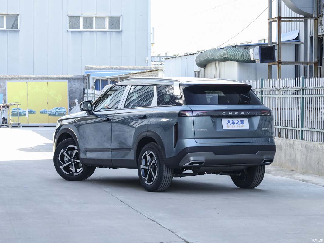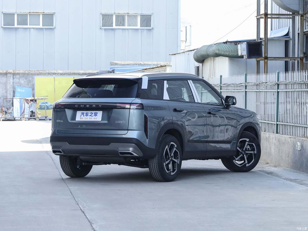 那这款车整体采用比较硬朗的设计风格,可以看到它整车都是比较方正的线条,而在前脸就能看到它采用时下流行的分离式头灯设计,同时它大尺寸的黑色水箱护罩中有 CHERY 的字样,并且在车身四周也有黑色的防刮塑料材质,整体的越野视觉氛围效果营造十分到位,而且虽然它算是一辆越野车,但是它整体还是相当精致,可以看到有隐藏式门把手、贯穿式尾灯及双边双出排气尾管等等。