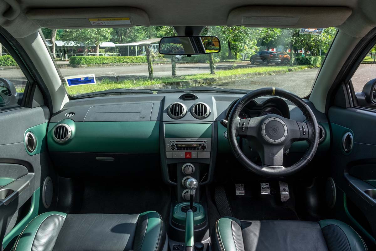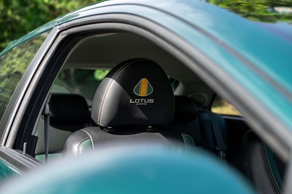 来到内饰的部分,这款车整体设计风格还是跟普通的 Satria 类似,但是整个内饰的质感更好,可以看到它的车内换上了和车身一样的 Lotus Green 经典青色皮质包覆,同时还有 R3 排挡头、专属 R3 地毯垫以及特制的皮革座椅,而且它的座椅头枕上更是搭配了 Lotus 的徽章,基本上可以给到你很好的战斗及驾驶氛围。