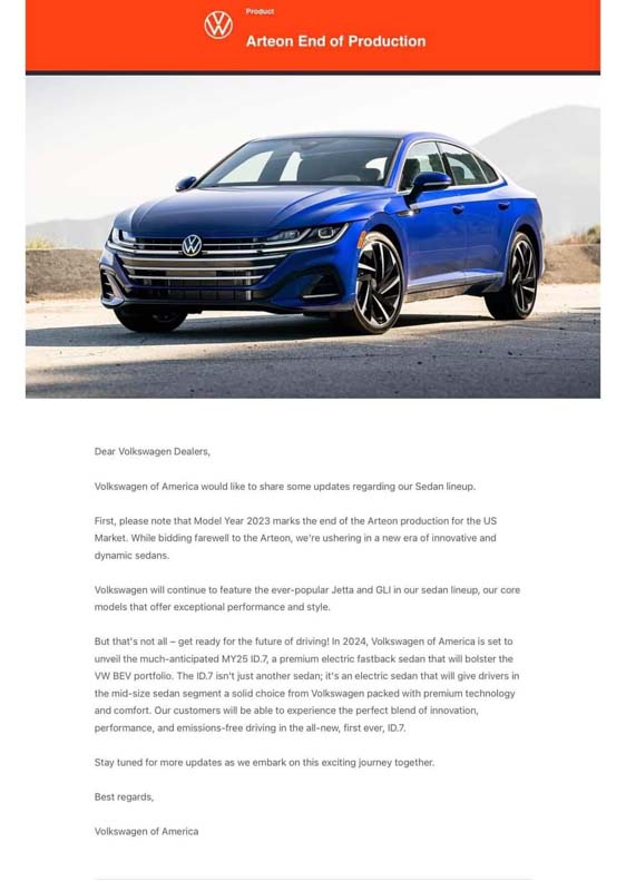 根据一份 Volkswagen of America 发给当地经销商的资料显示,目前 Arteon 是已经正式在当地停产了,而未来他们在当地的轿车车型 Jetta 和 GLI 则会获得保留,那在这款车停产之后,原厂将会改以电动车 ID. 7 来替代它所留下的市场空缺,而这款车不仅是一辆轿车,它是原厂倾注心血及最新的科技打造的,同时因为这款车是他们瞄准以 Tesla 为对手而开发打造的,所以相信应该会更受美国市场的欢迎,有望取得比现在更加出色的销售成绩。