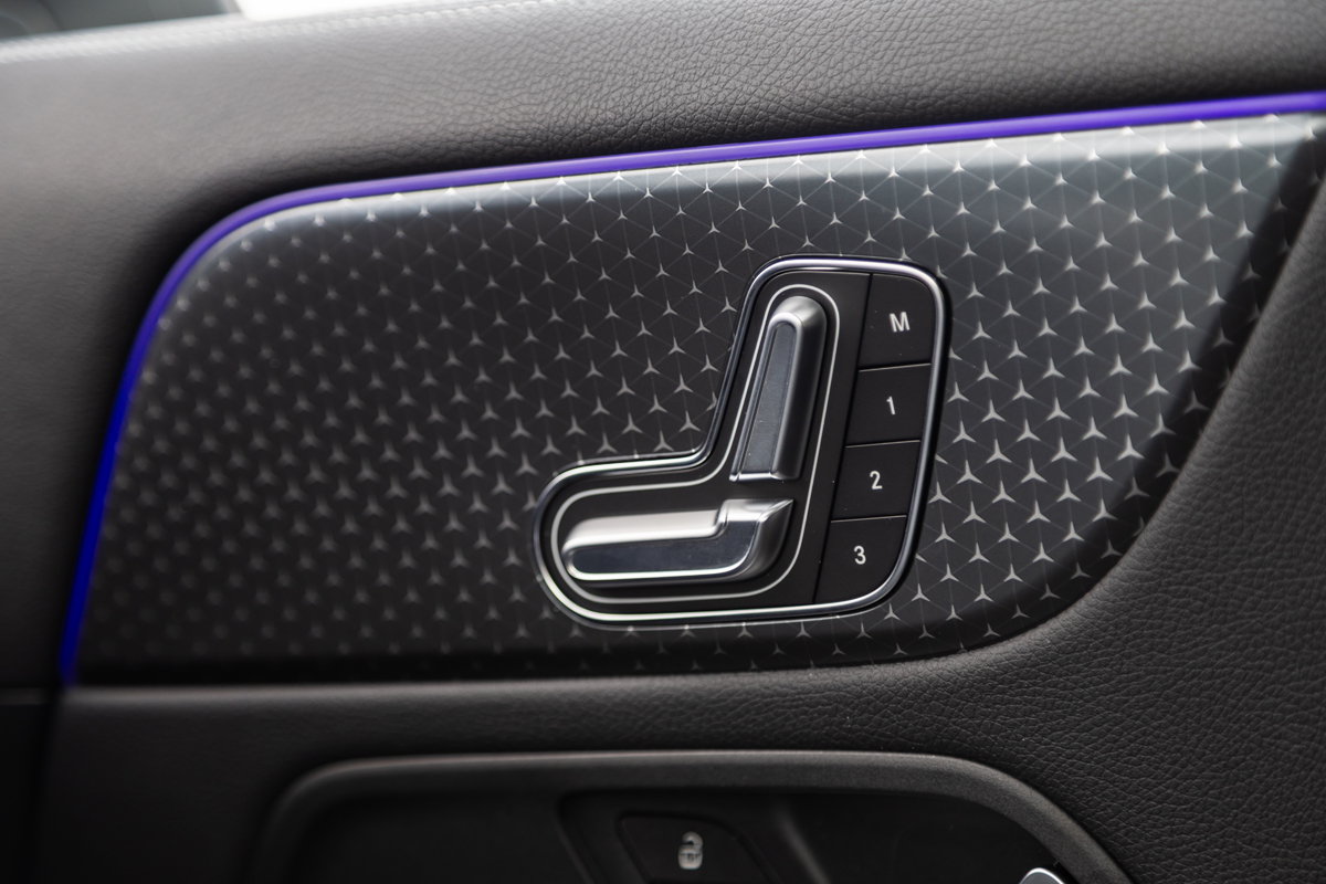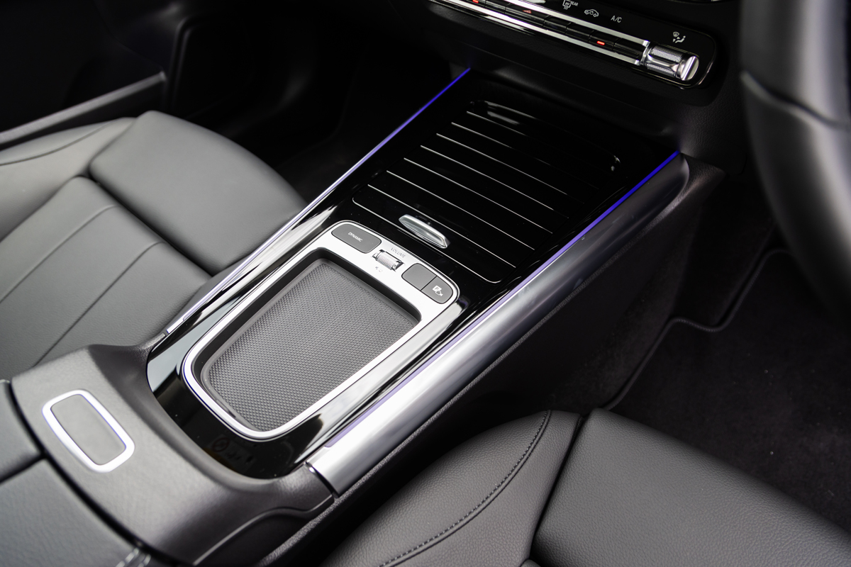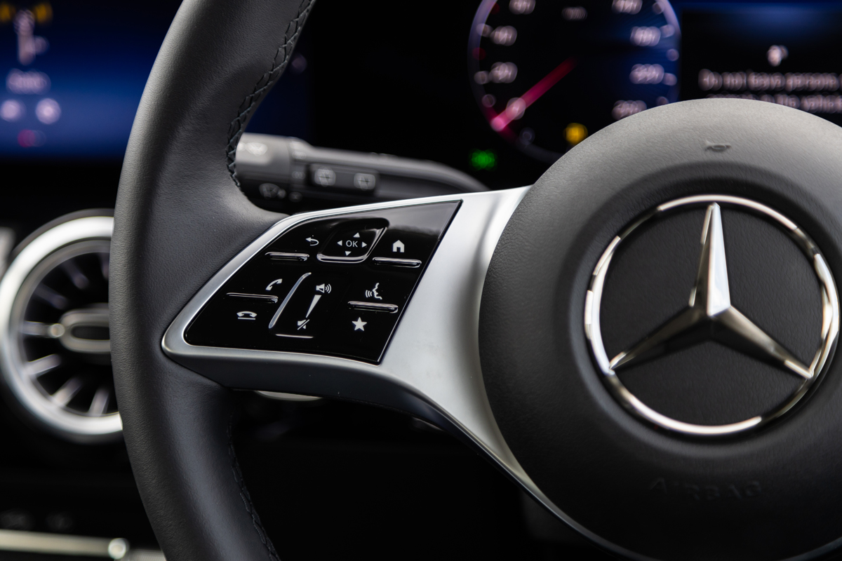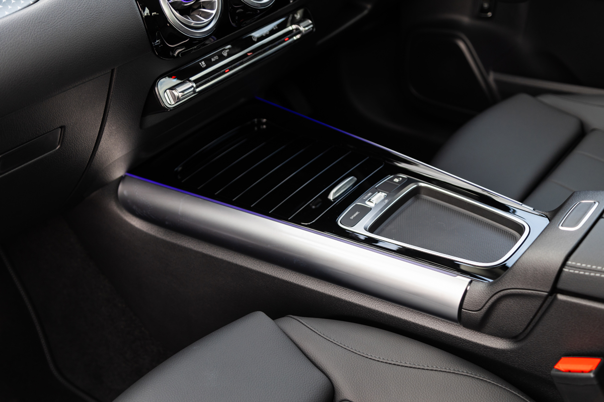 来到内饰的部分,可以看到这款车依然是沿用了分别是 10.25 寸的全液晶仪表及中控触屏主机组成的双联屏设计,不过主机里面内置了最新的 MBUX 操作系统,对比之前它新增了 Navigation 导航、Assistance 辅助及 Services 服务的功能,而且这款车也支援无线 Apple CarPlay 及 Android Auto 手机连接功能,另外原厂也为它换上了新的运动方向盘,让你在掌握方向盘时可以更好地感受车子的运动氛围,同时在中央鞍座上的旋钮控制被取消,改换成了置物空间,当然奔驰家族的必备的 64 色氛围灯也是少不了的。