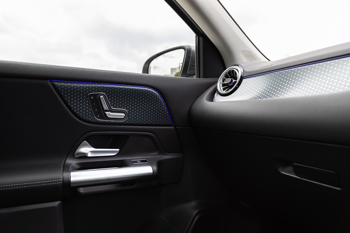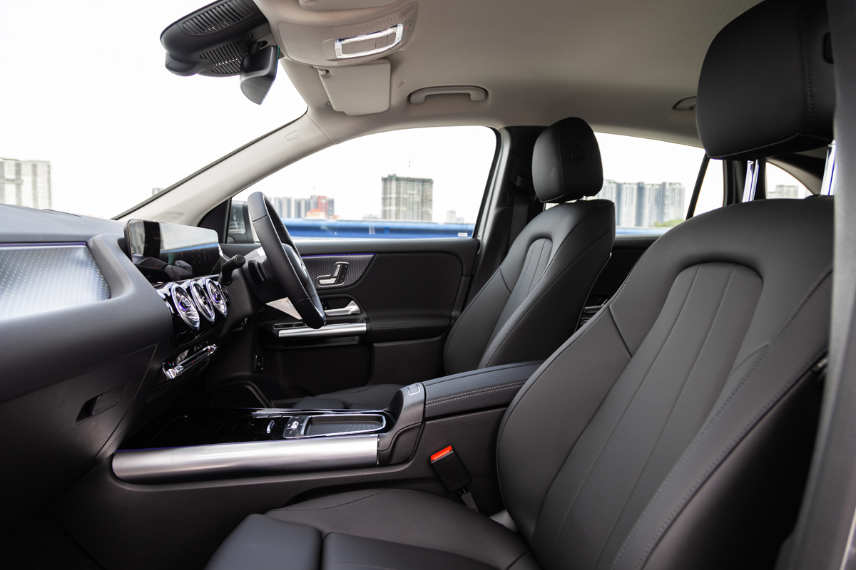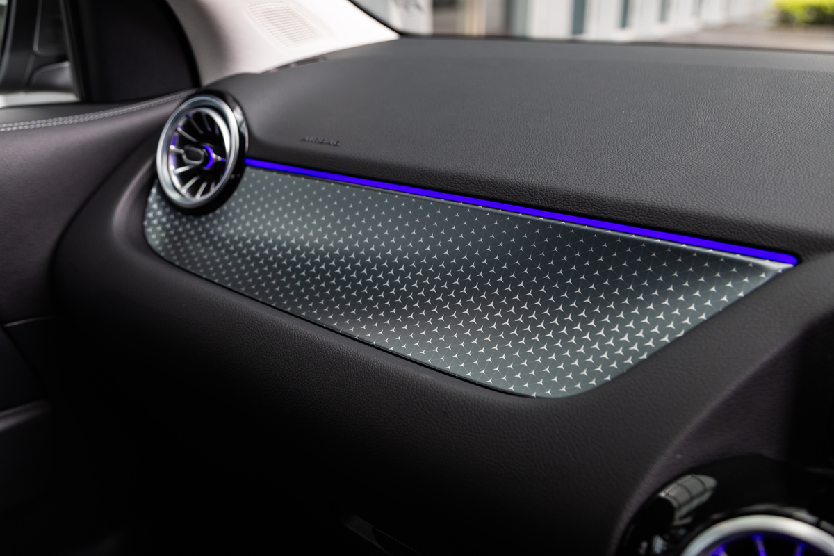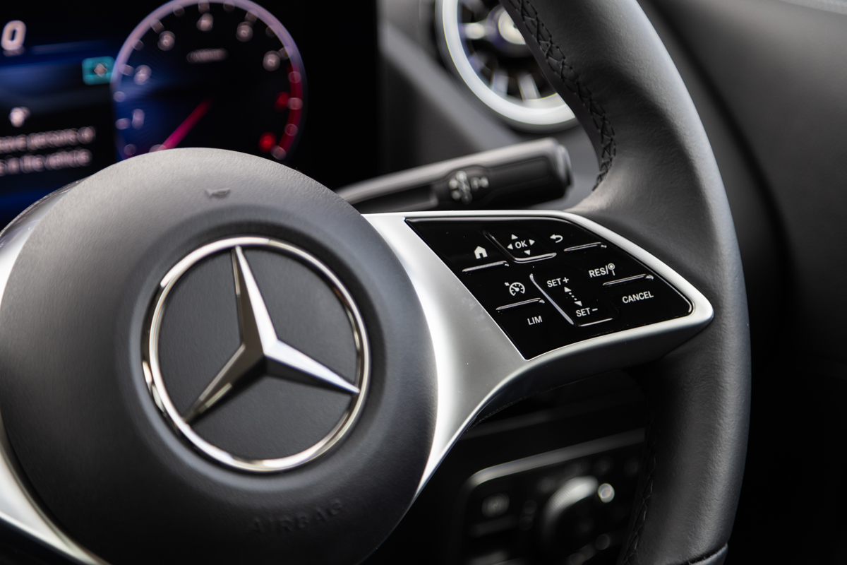 来到内饰的部分,可以看到这款车依然是沿用了分别是 10.25 寸的全液晶仪表及中控触屏主机组成的双联屏设计,不过主机里面内置了最新的 MBUX 操作系统,对比之前它新增了 Navigation 导航、Assistance 辅助及 Services 服务的功能,而且这款车也支援无线 Apple CarPlay 及 Android Auto 手机连接功能,另外原厂也为它换上了新的运动方向盘,让你在掌握方向盘时可以更好地感受车子的运动氛围,同时在中央鞍座上的旋钮控制被取消,改换成了置物空间,当然奔驰家族的必备的 64 色氛围灯也是少不了的。
