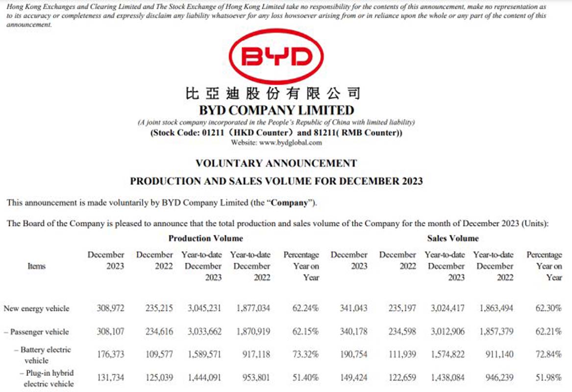 恭喜 BYD!比亚迪 2023 成绩单:售出超 3,000,000 辆车,同比大涨 62.3%,稳坐中国品牌一哥宝座。