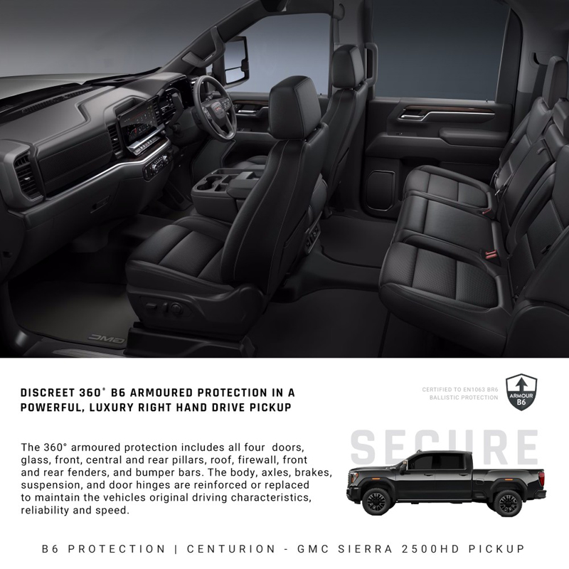那在 Sierra 2500 HD 皮卡则只有一个 Centurion 车型,它搭载了有 420 Hp 最大马力的 6.6L 汽油引擎或是 6.6L 柴油涡轮增压引擎,匹配 10 速的 Allision 自排变速箱,同时它也支援 B6 级的防弹及防爆,是一款集性能与安全性的皮卡车型。