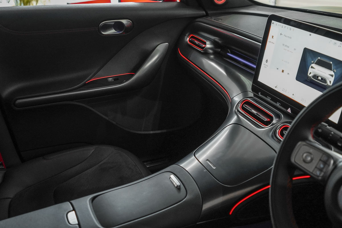 当然好看的外观必须配合精致的内饰,而 smart #1 的内饰就遵循了极简设计风格,而且由于大多数功能都被集成在触屏主机内,因此整个内饰看不到太多实体按键,你也可以看到整个黑白双拼色的内装看起来相当地高级,另外它有着 9.2 寸全液晶仪表、12.8 寸的中控触屏主机以及 10 寸彩色抬头显示器,这个主机内置了 Snapdragon 8155 处理器,加上 12 GB RAM + 128 GB ROM 可以确保你的流畅使用,同时它还支援智能语音控制,很多功能都可以通过语音指令自动完成,而且它还有 Wireless Apple CarPlay 及 Android Auto 功能,并且还有手机无线充电面板,让你可以随时为手机充电,另外它还有 64 色氛围灯及超大的全景天窗,因此不管是看夜景还是晚上开车氛围感都超好,加上还有 13 个扬声器的 Beats 名牌音响,可以给到你绝佳的听觉盛宴。如果你是买到 BRABUS 性能版的话,它的车内就有全黑的内饰,加上红色的车缝线点缀,还有 Alcantara 方向盘及头枕上 BRABUS 的 Logo,给到你绝佳的战斗氛围。