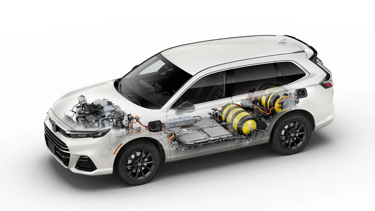 在 CR-V e:FCEV 拥有一个重量为4.5公升的氢气罐,在充满氢气的情况下可以行驶434公里,而且因为 CR-V e:FCEV 的重量分布和普通版本不一样,因此原厂中心针对车辆的悬吊以及车体刚性进行了重新的调整,除此之外这款车最大的不同之处就是提供了一个17.7 kWh 的电池组,可以提供46.7公里纯电续航,并且具备了充电口(原厂并未提及充电速度),所以这也是目前市场上唯一一款可以充电又可以使用氢气的新能源车。