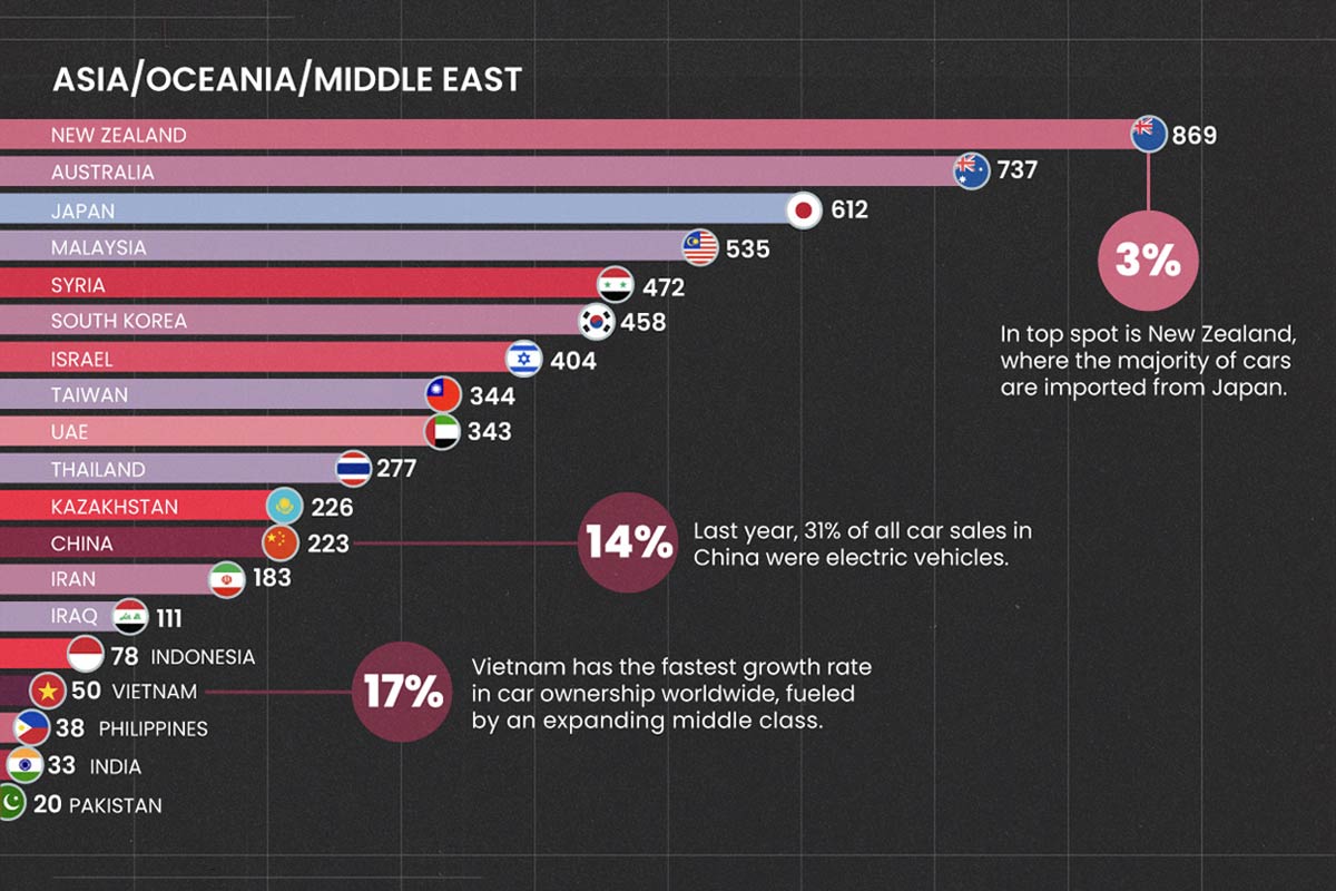 根据《Visual Capitalist》的报道,他们就以每 1,000 人里面拥有多少辆车来排名全球各国/地区的拥车率,而在所有的 63 个国家和地区中,大马就以每 1,000 人中拥有 535 辆车排在了第 24 位,虽然乍看之下好像还不算太过严重,不过如果看细分的话,大马在亚洲、大洋洲和中东的分类里面的排名是第四,仅次于纽西兰(869 辆/1,000 人)、澳洲(737 辆/1,000 人)及日本(612/1,000 人)这几个我们熟悉的汽车大国(销量),对比起我们的邻国泰国及印尼则分别排在第 10 名(277 辆/1,000 人)和第 15 名(78 辆/1,000 人)。