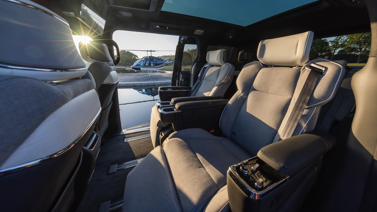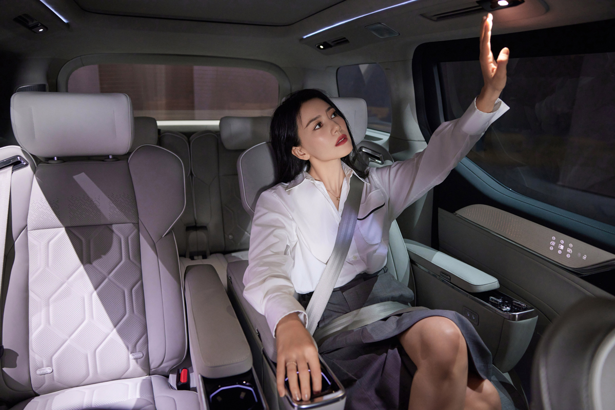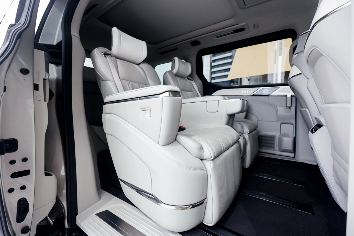 另外作为豪华 MPV,它的重点绝对是在第二排,这款车采用的是 2 + 2 + 2 的 6 人座布局,它的第二排是两张独立的 Captain Seat,它有着出色的人体工学设计,号称可以给到你出色及舒适的乘坐体验,另外除了基本的电动调节,座椅加热及通风功能外,这个座椅还提供了按摩功能,并且它还配有一个折叠桌板,可以让你在上面吃饭或处理公务等,另外值得一提的是它的冷气控制是镶嵌在门板上的屏幕,整个看起来很有科技感。